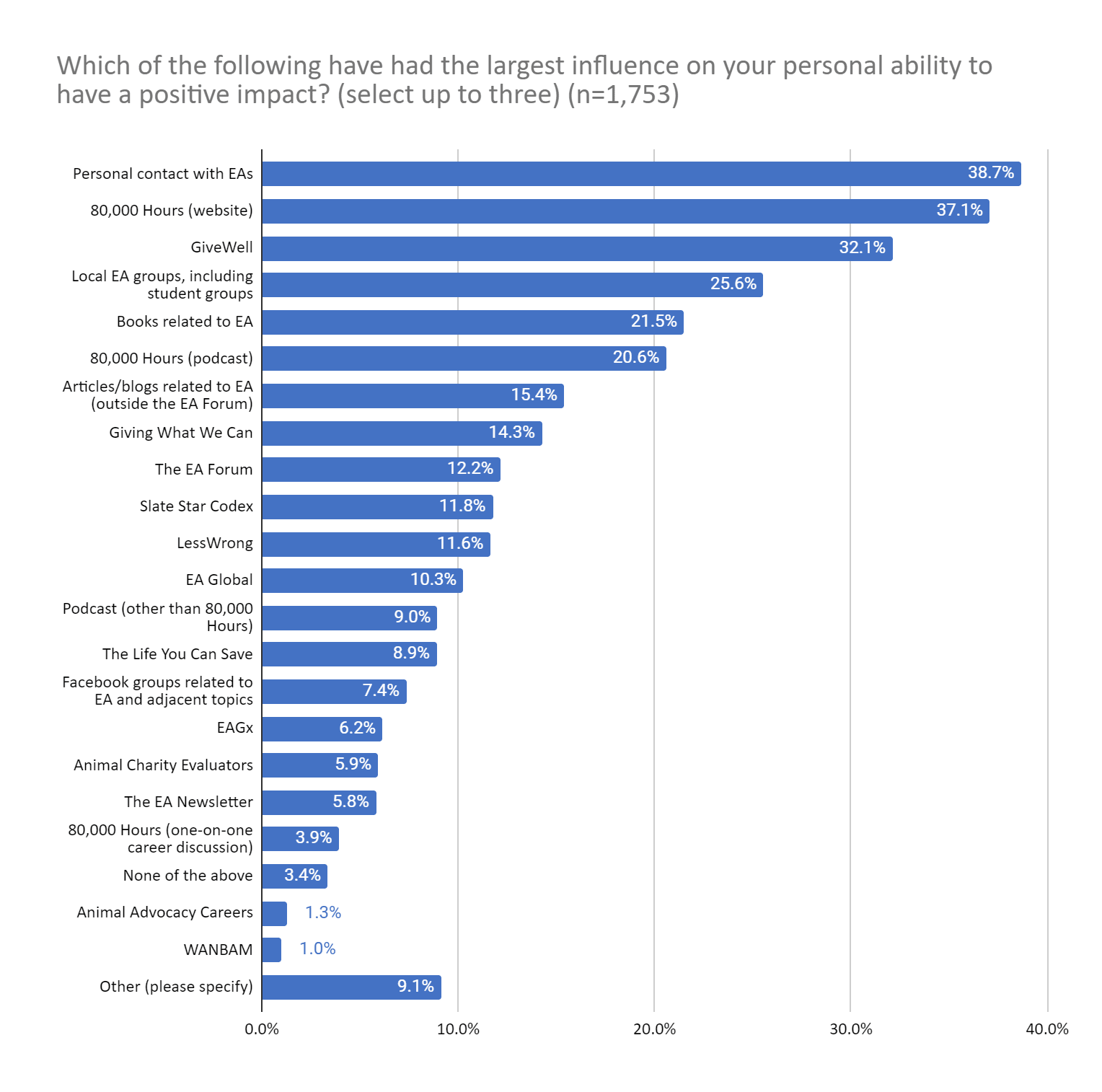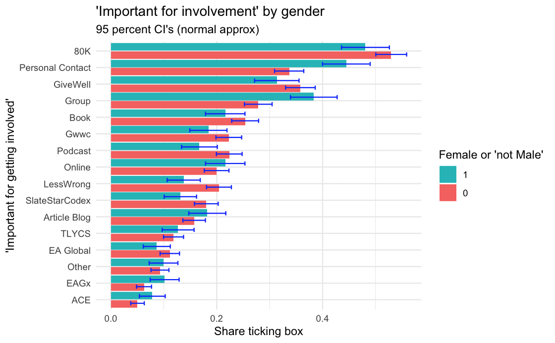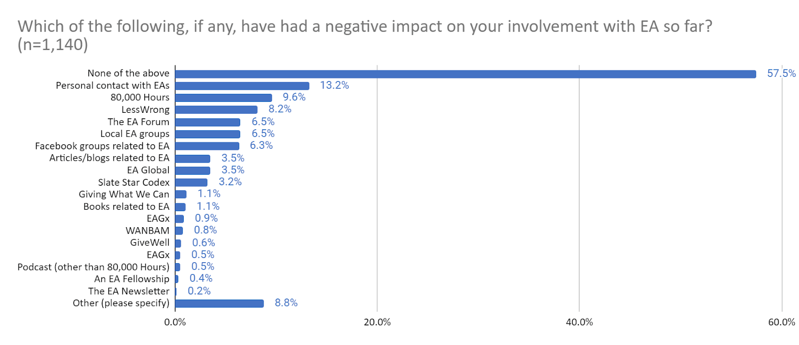 - Notwithstanding the negative Forum articles you link, EA groups are not cited particularly often as a negative influence on people’s involvement in EA (6.5% of respondents, similar to the EA Forum and a lower absolute percentage than personal contacts or 80K [bear in mind that the absolute percentage of people selecting a factor may simply reflect the fact that lots of people have encountered it]). Its ratio for positive:negative influence is not particularly poor (less good than 80K, but better than personal contacts)