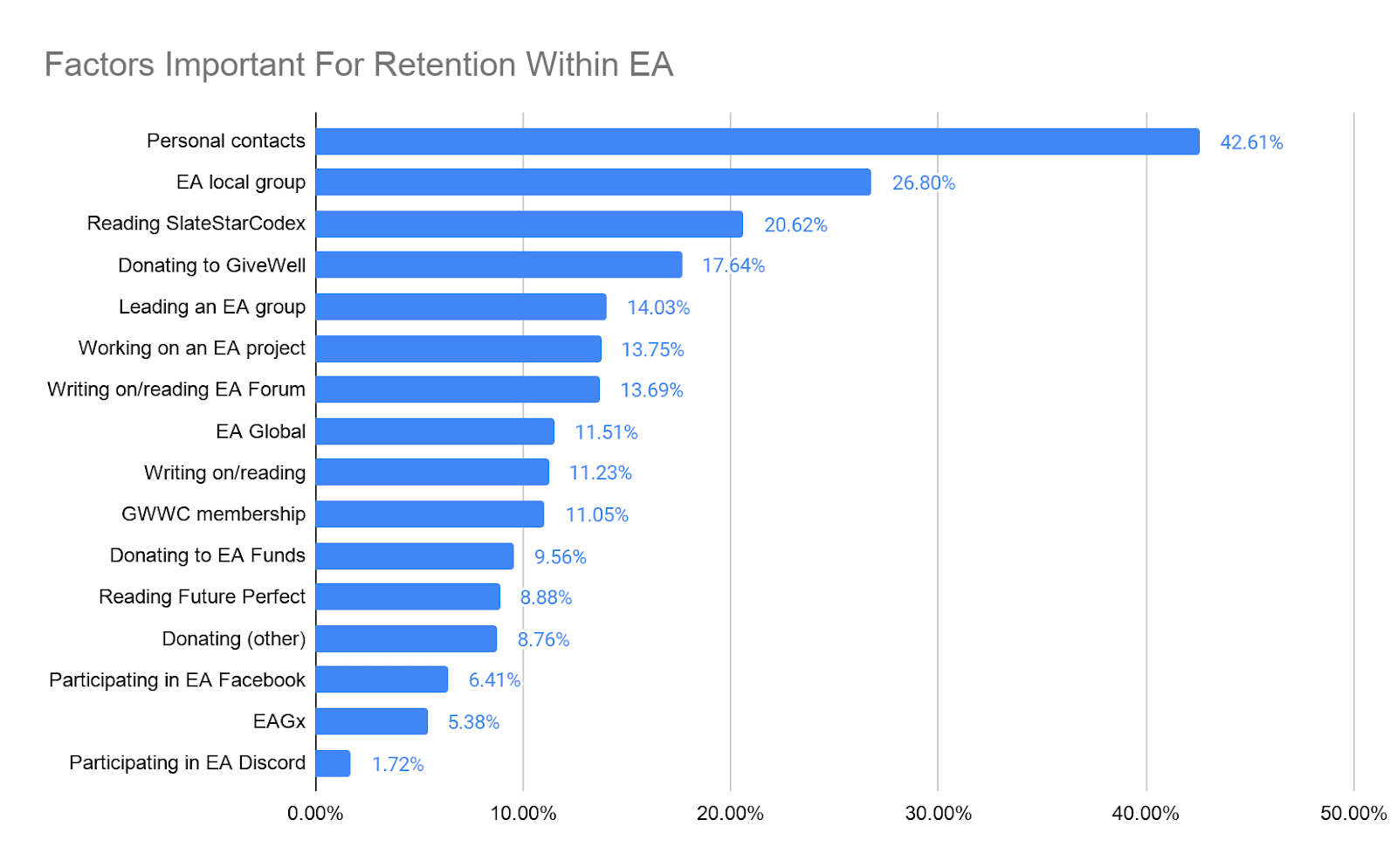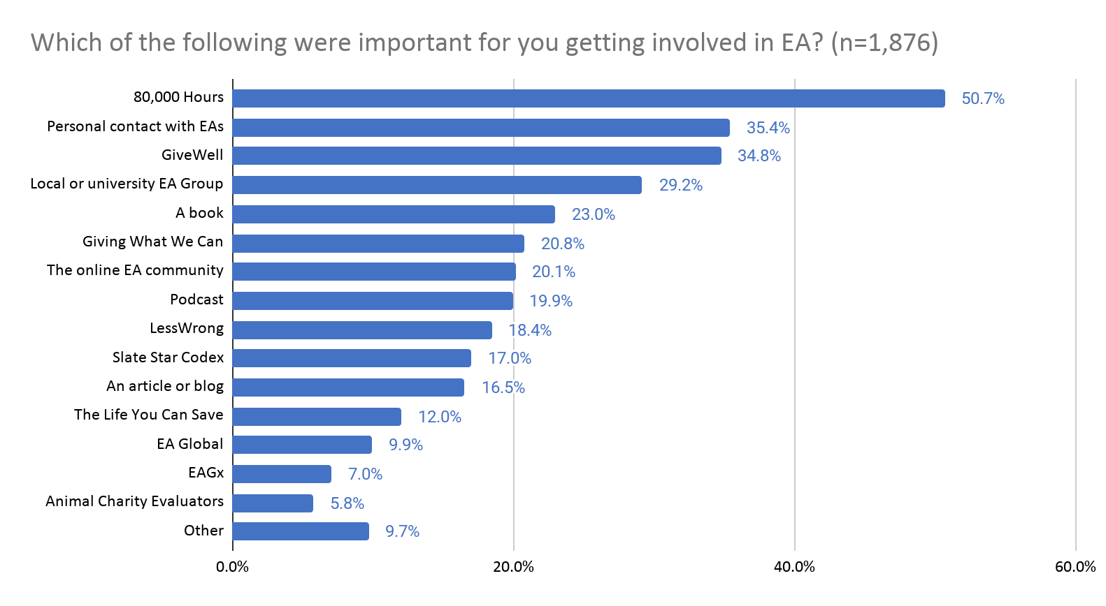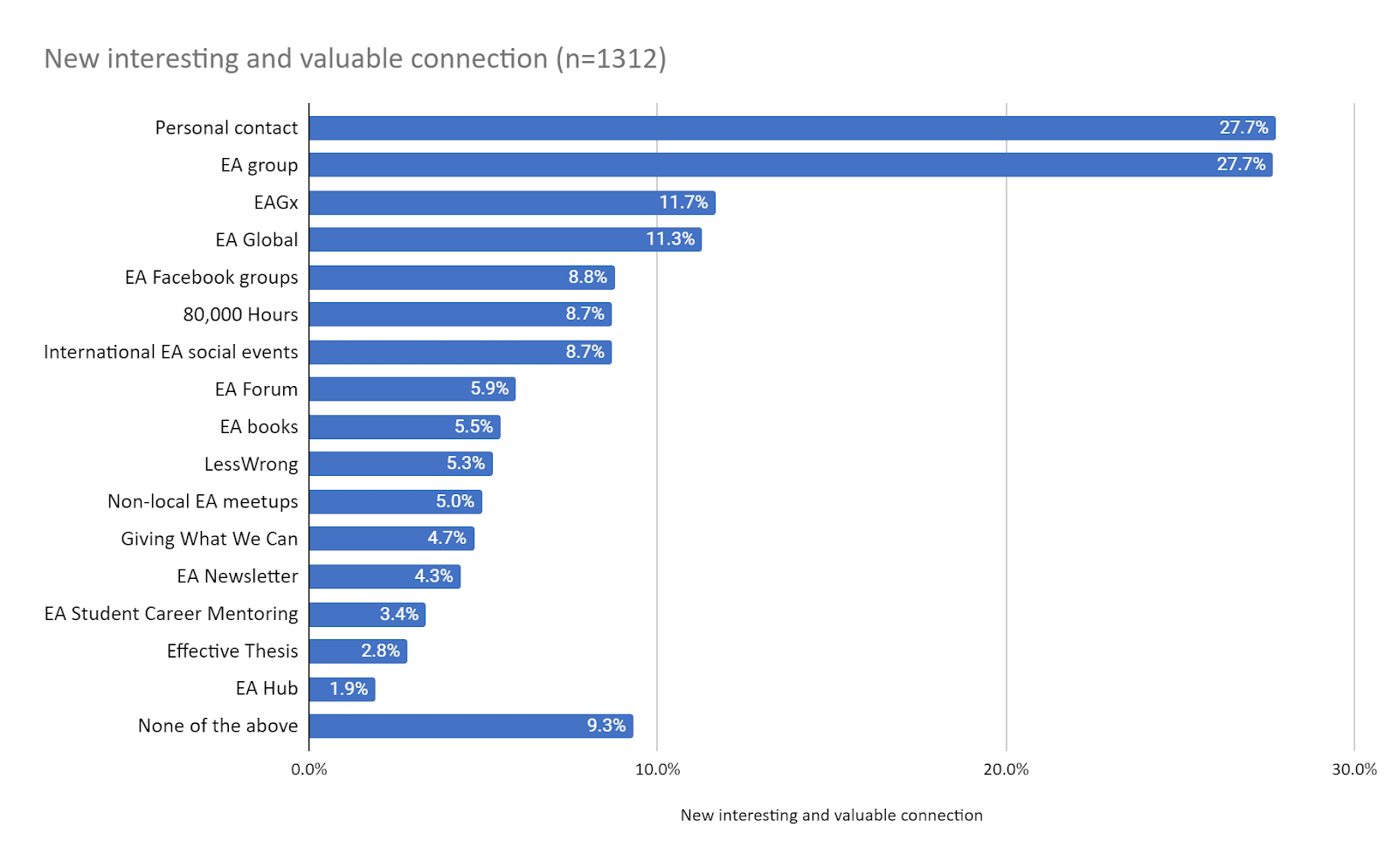 It’s my impression that, for many years, EA groups were neglected due to the illegibility of their impact. Their impact is mostly indirect through getting EAs involved, increasing their connection and engagement with EA, keeping them engaged and directing them to other paths of impact. It's possible to make the case that many other activities have a more direct relation to impact. And yet, per the above, very few activities seem to be as commonly cited as important by as many EAs as do EA groups (and this despite many EAs not having the chance to be a member of an EA group).