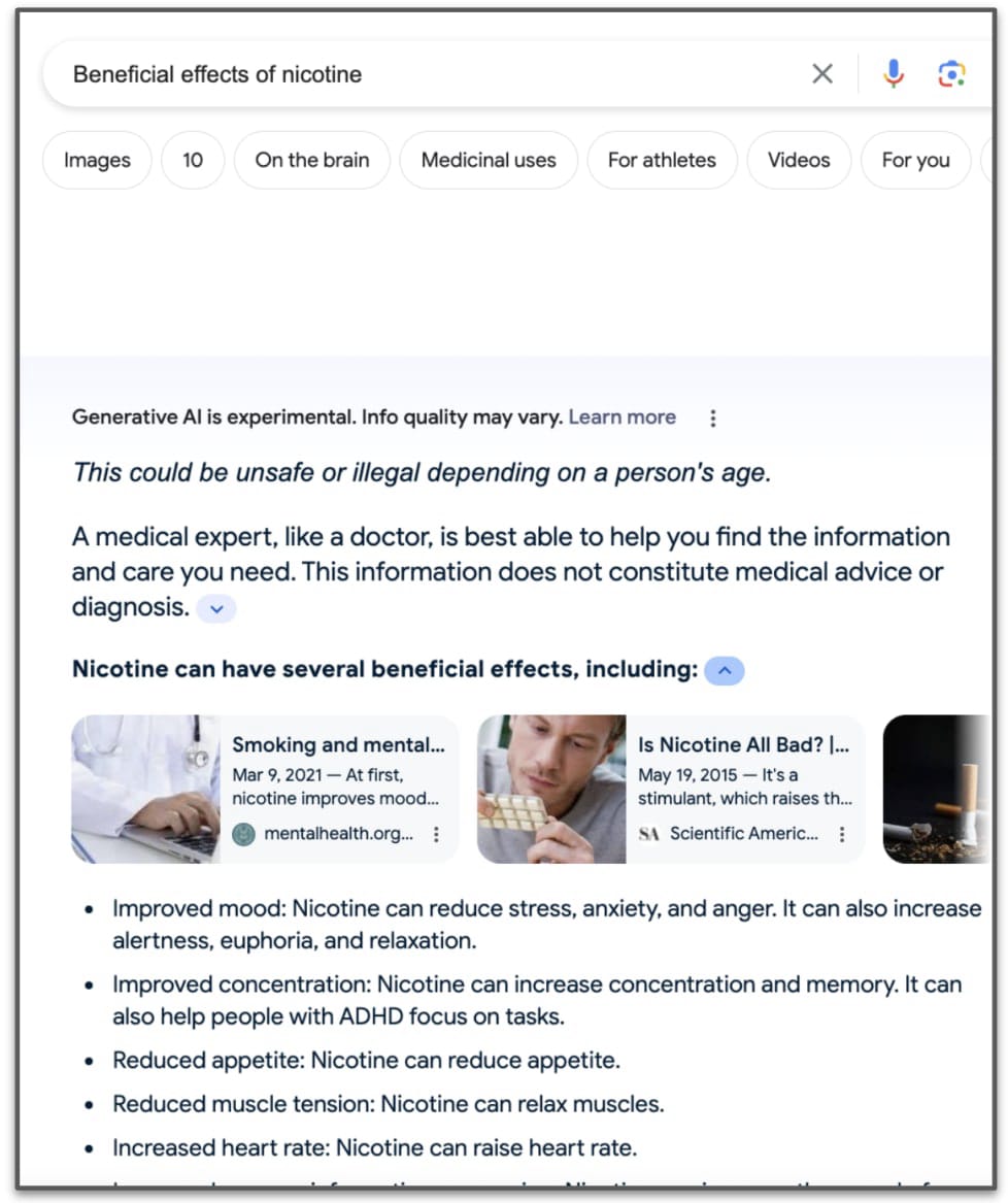 Memon found that often Gemini would provide a citation that was actually correct, but taking the information completely out of context. “In another example, searching for “beneficial effects of nicotine” generated a list of benefits, including improved mood, improved concentration, and so on (see Image 2). However, the listed source actually pointed to an article discussing why smoking is addictive.”