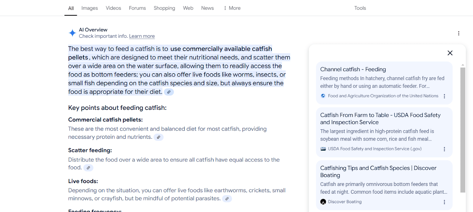 Google is offering a solution to the Hallucination problem. Beside each section of an AI overview, Google will cite a source. Look at the screen grab below. On the left is Gemini’s answer, on the right are clickable links that it is claiming are its sources.