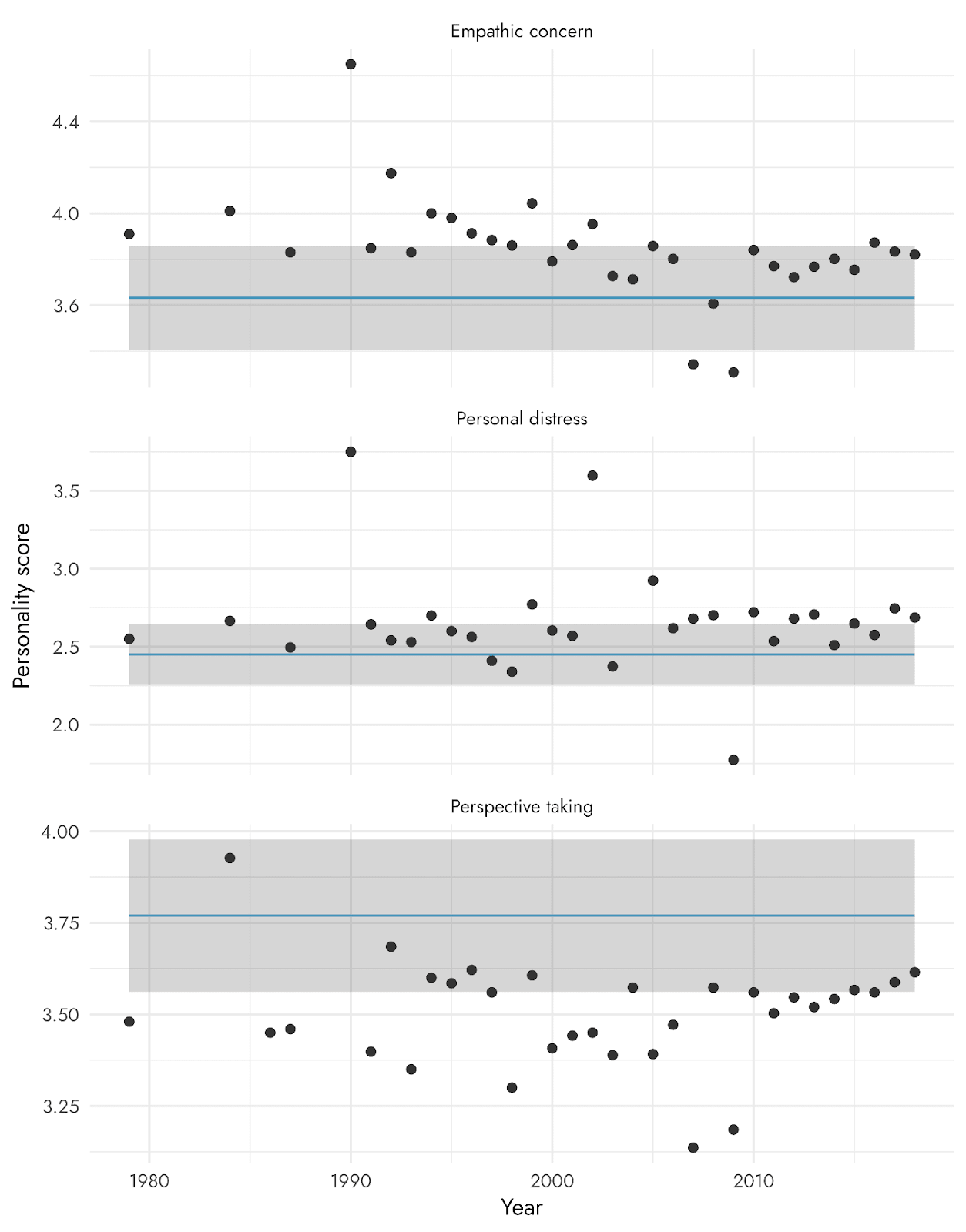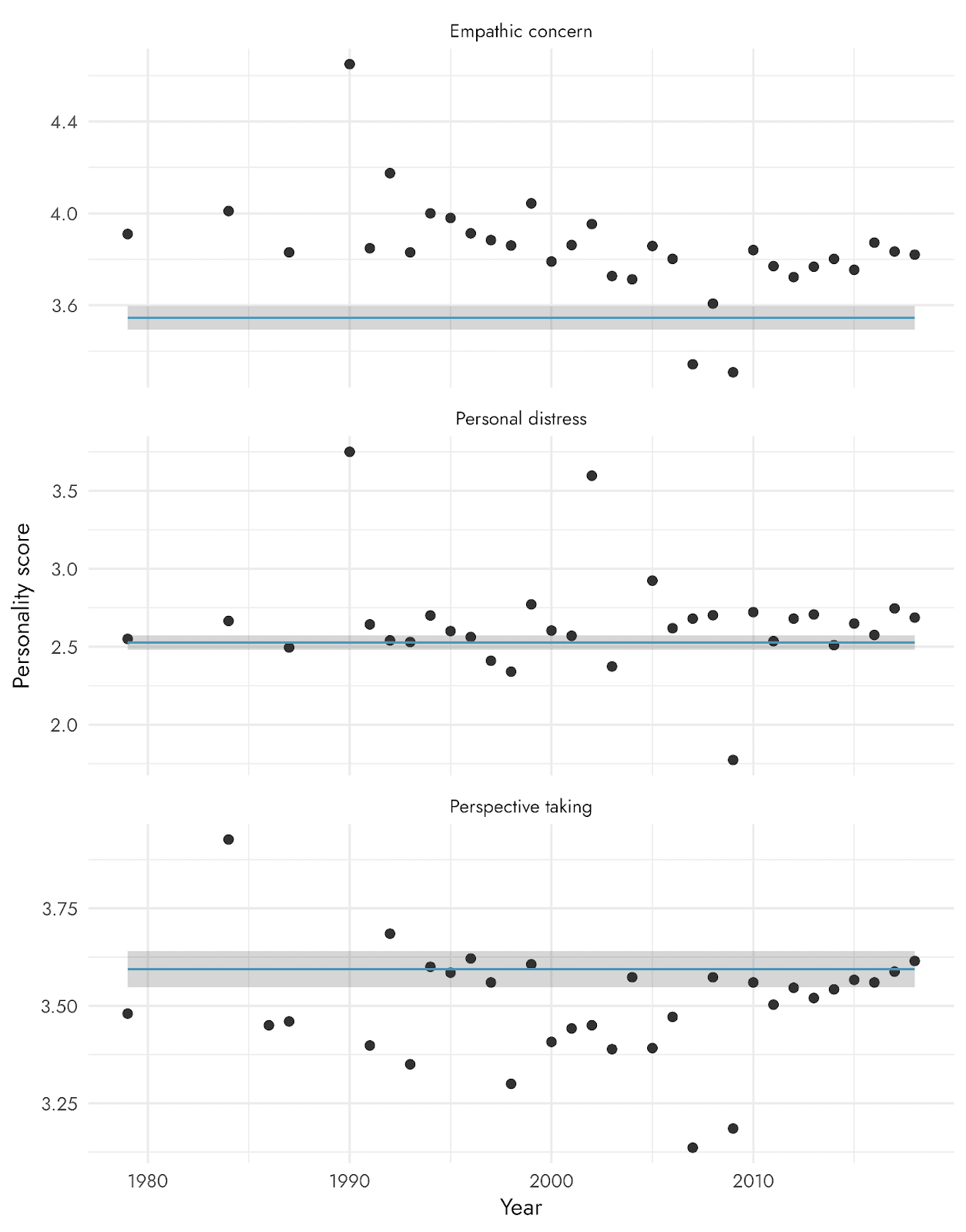 Unfortunately, we’re not aware of any recent population norms so we cannot compare our results to see whether the EA sample scores particularly low or high on any of these traits. However, there is research on dispositional empathy among U.S. undergraduates from 1979 to 2018. The graph below shows the average personality scores of the IRI across the years, with horizontal lines indicating the average scores of EAs from our survey.