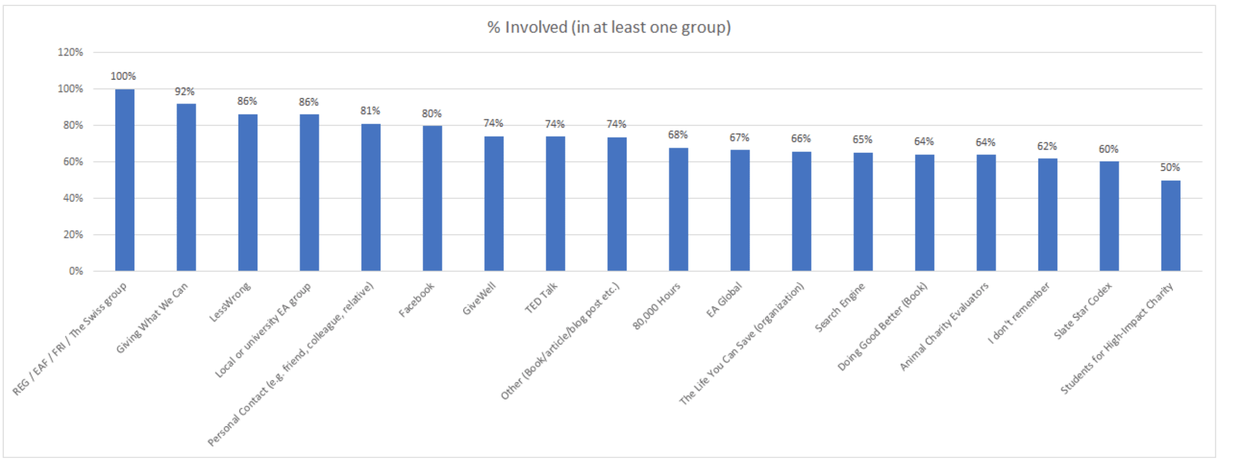 We also examine the percentage of EAs first hearing about EA from each source who are involved (in at least one of the EA groups listed above) versus not involved in any.