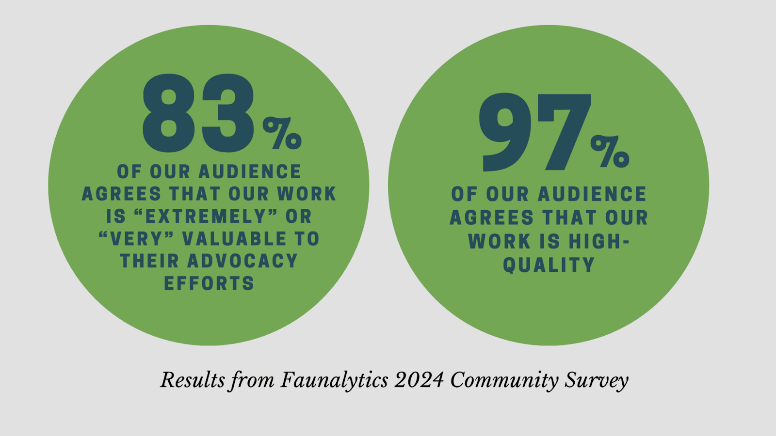 A note about cost: Faunalytics’ work informs hundreds of thousands of viewers each year, but our impact can’t be condensed into quantitative outputs alone. Our aim isn’t just to increase the number of original research studies or data sets available to the movement, but to focus on maximizing the impact of each project. Determining the impact of Faunalytics’ work per dollar invested is complex since research and capacity-building are indirect aspects of advocacy. Research is more than study design, data analysis, and reporting; it also includes the time we spend following up with advocates and organizations to ensure they understand the findings and use them effectively. As such, we’re proud to share the following highlights and testimonials: