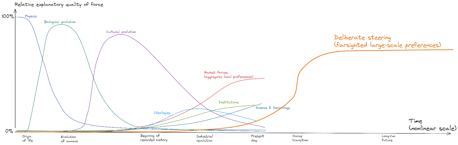 Here some forces, like “market forces” or “science and technology”, feel like they’re reasonable analogues of the earlier forms of evolution. Other lines on the graph, like “ideologies” and “institutions”, are perhaps better thought of as aggregates of many smaller forces (one for each ideology or institution).