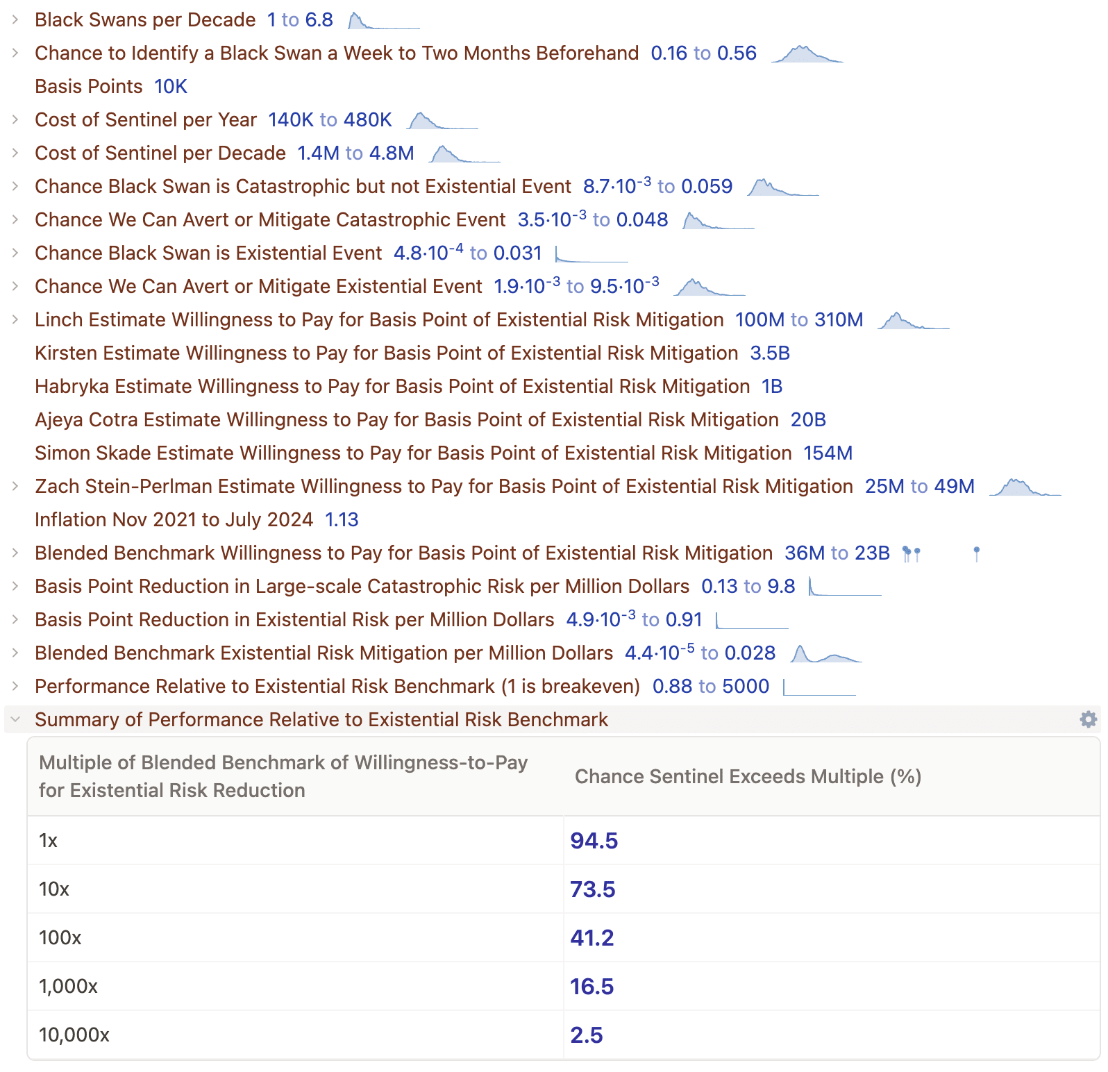 Below is our estimate of the cost-adjusted impact of Sentinel on existential risk. It is a lower bound on the value of the project as a whole since it doesn't attempt to model the information value derived from our experimentation that can benefit other projects. We invite you to play with the assumptions in the interactive version here.