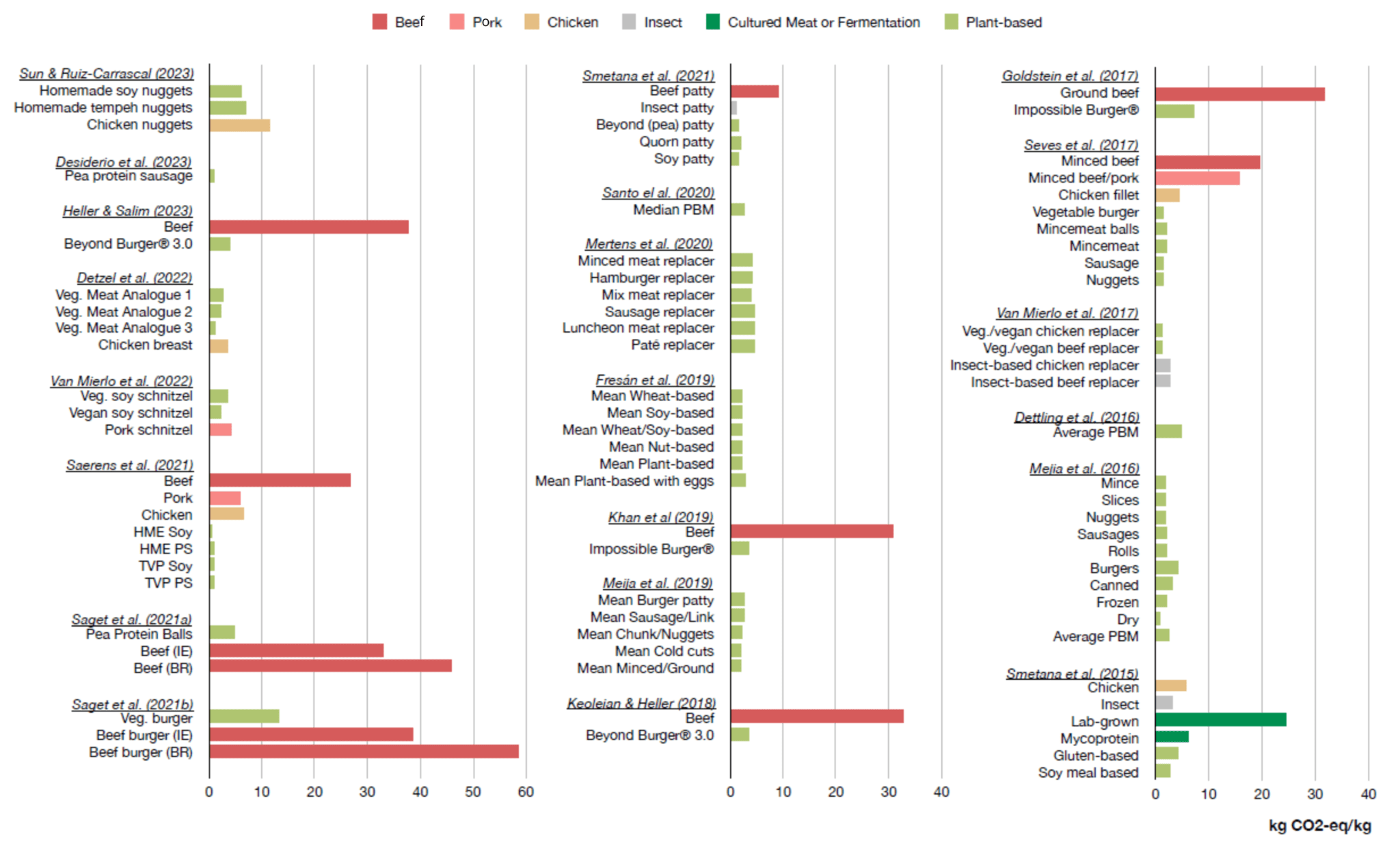 On the environmental side, all available LCAs show lower greenhouse gas emissions than conventional meat, with the gap being largest for beef (up to 10x less). Land use requirements are also dramatically lower, which matters not just for its own sake but because land spared from animal agriculture could support ecosystem restoration and carbon sequestration.
