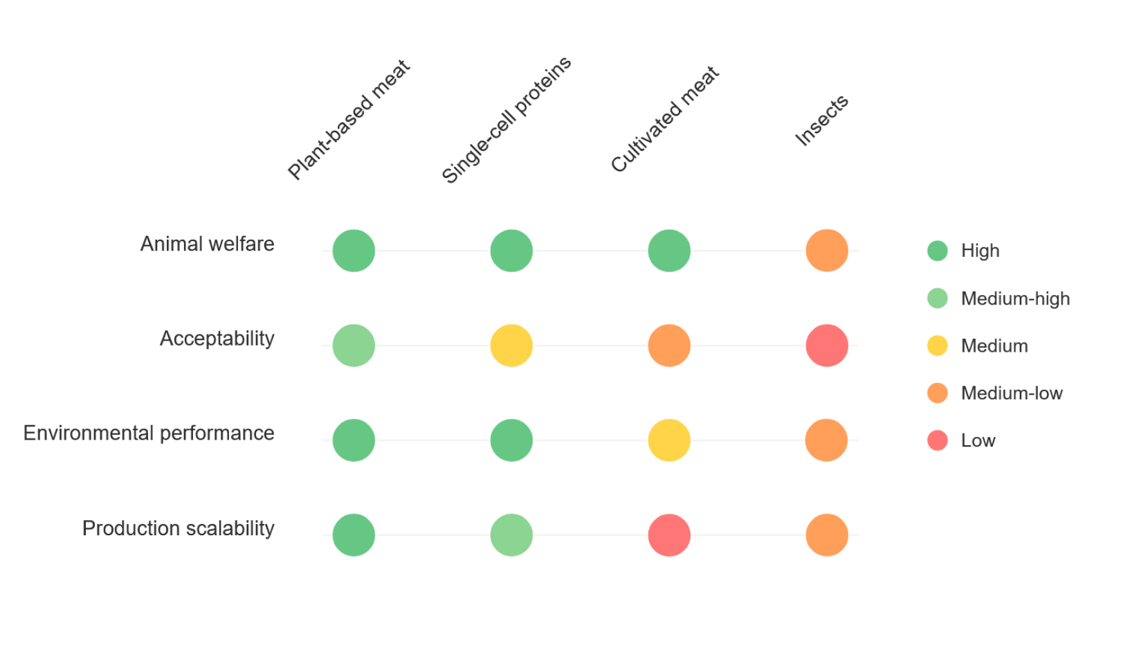 In the paper, I try to address both problems by comparing four categories of alternative proteins (plant-based meats, cultivated meat, single-cell proteins, and insects) across four dimensions: environmental impact, production scalability, consumer acceptability, and animal welfare.