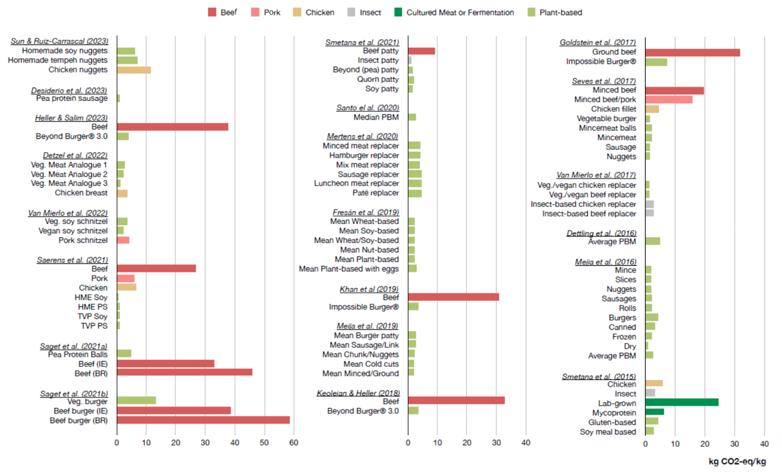 Plant-based meat demonstrably remains more promising from an environmental perspective. Below is a synthesis of the LCAs I've found regarding greenhouse gas emissions from different plant-based meats, noting that this is quite a broad category with, for example, processing methods that can vary considerably, which influences the final result.