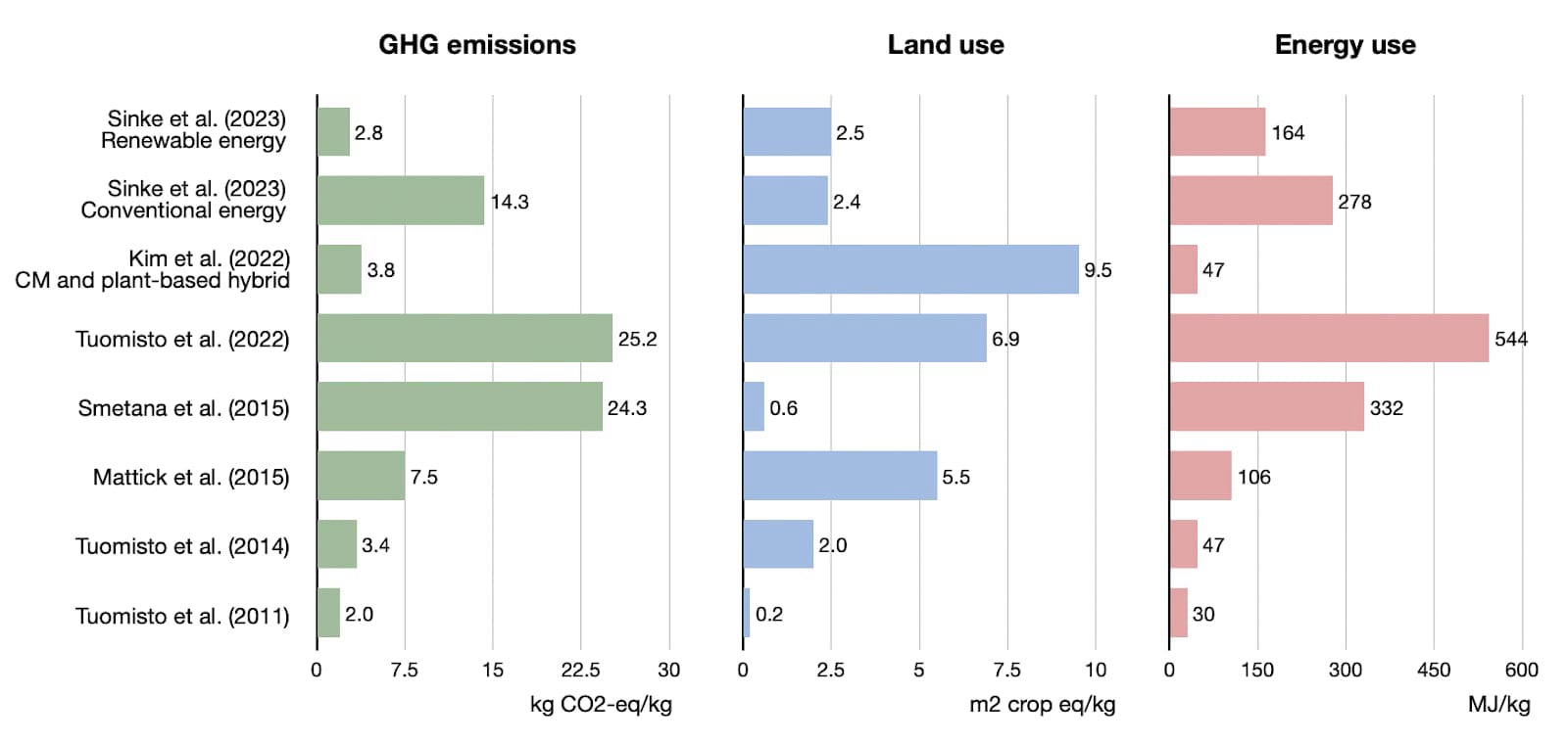Comparison of the results of selected life cycle analyses about cultivated meat published in peer-reviewed journals.