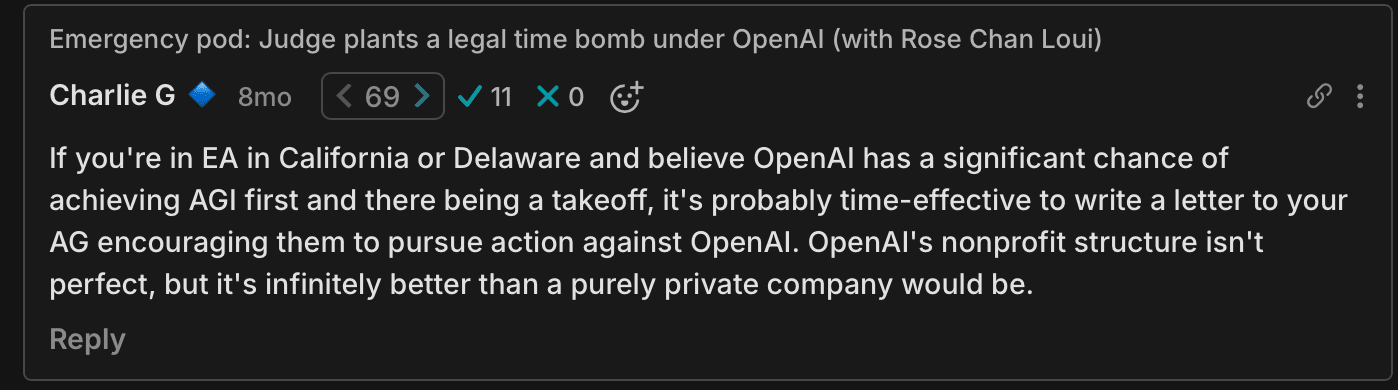 Perhaps equally importantly, this shows that the state AGs have a real interest in maintaining the governance of these companies. These will be the same people enforcing controls on the governance structures of these organizations as they develop into corporations with considerable influence over our future. It's encouraging that they already appear to be taking this responsibility seriously.