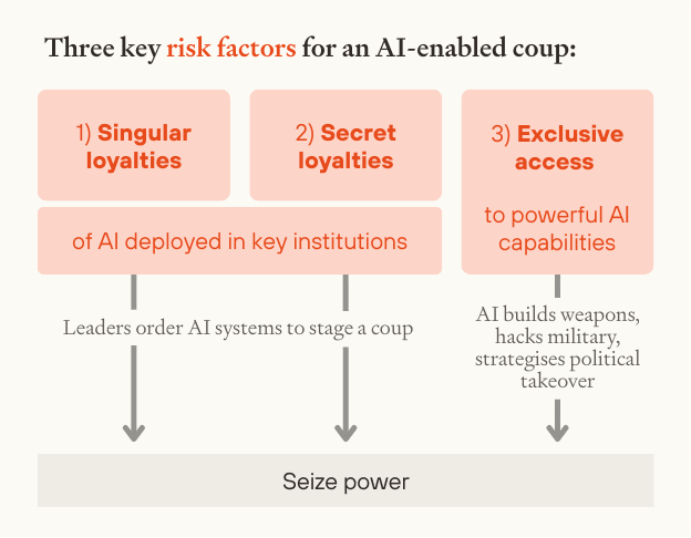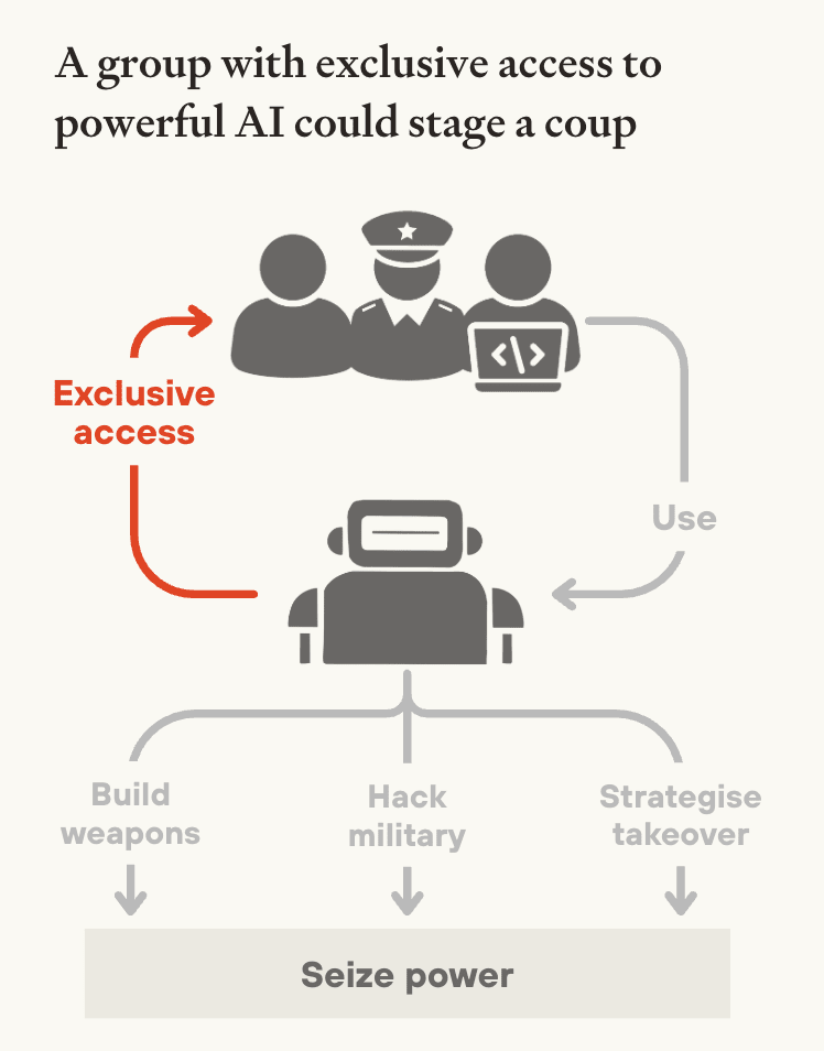 Furthermore, exclusive AI access significantly exacerbates the first two risk factors. A head of state could rely on AI systems’ strategic advice to deploy singularly loyal AI in the military and assess which AI systems will help them stage a coup. A CEO could use AI R&D and cyber capabilities to instil secret loyalties that others cannot detect.