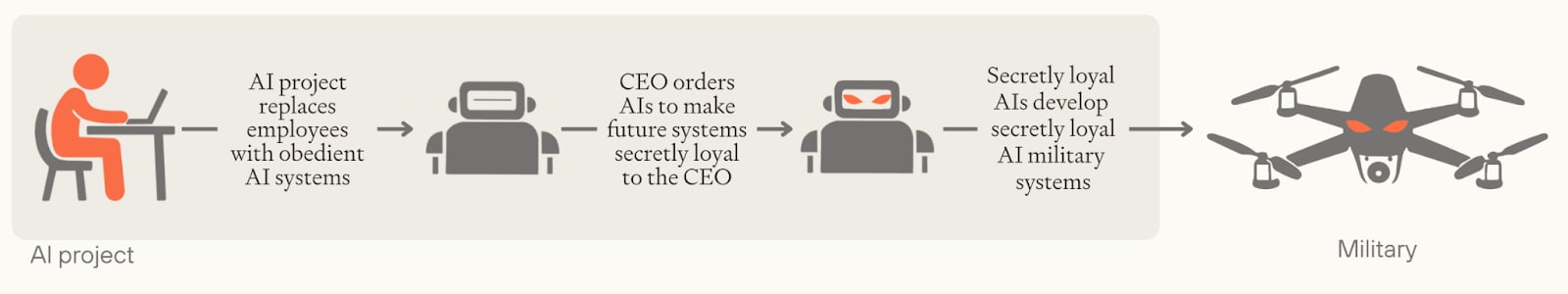 While secret loyalties might be introduced by government officials or foreign adversaries, leaders within AI projects present the greatest risk, especially where they have replaced their employees with singularly loyal AI systems. Without any humans knowing, a CEO could direct their AI workforce to make the next generation of AI systems secretly loyal; that generation would then design future systems to also be secretly loyal and so on, potentially culminating in secretly loyal AI military systems that stage a coup.