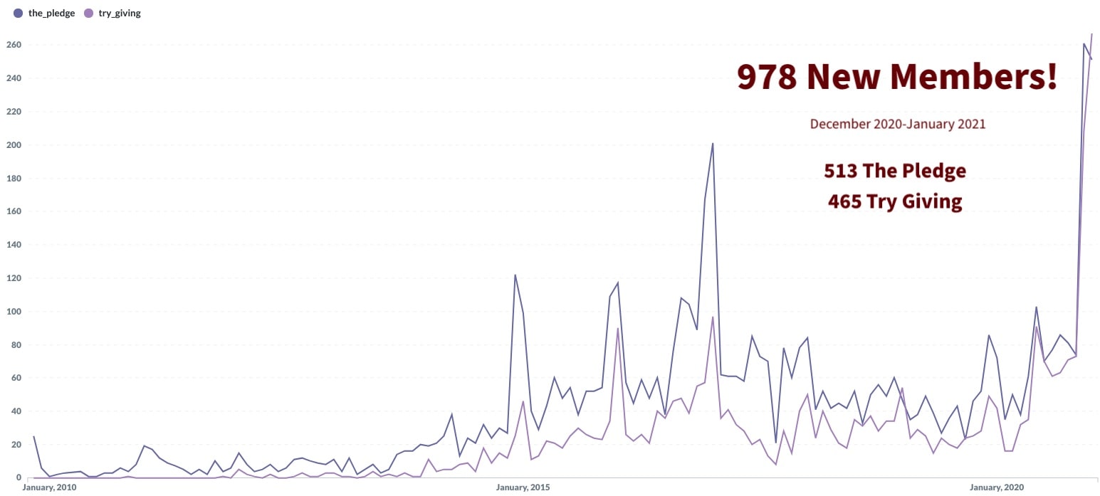 As of the end of January 2021, our community now has 5,718 total members of The Pledge/Further Pledge and 961 active Try Giving Pledges! Together we've already donated over $219 million and pledged over $2 billion. We're so excited to see our community growing, and our members being so generous.