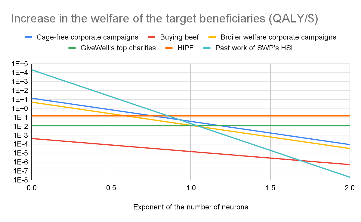 HIPF is much more cost-effective than the other interventions for any exponent of the number of neurons. The slope of the cost-effectiveness of all interventions besides the past work of SWP’s HSI becomes less negative once the effects on the target beneficiaries start to dominate, since these have more neurons than soil ants, termites, springtails, mites, and nematodes.