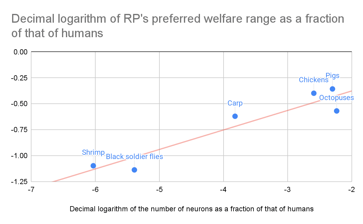 RP’s moral weight project included a report by Adam Shriver concluding “there is no straightforward empirical evidence or compelling conceptual arguments indicating that relative differences in neuron counts within or between species reliably predicts welfare relevant functional capacities”. I guess there are other factors besides the number of neurons that influence the welfare range. However, an exponent of 0.188 explains 78.6 % of the variance of the estimates in Bob’s book. So I prefer to rely on a simple formula to decrease noise, and easily obtain estimates for animals not covered in the book to explore implications for cause prioritisation. I get that exponent from the slope of a linear regression with null intercept of the logarithm of RP’s preferred welfare range as a fraction of that of humans on the logarithm of the number of neurons as a fraction of that of humans.