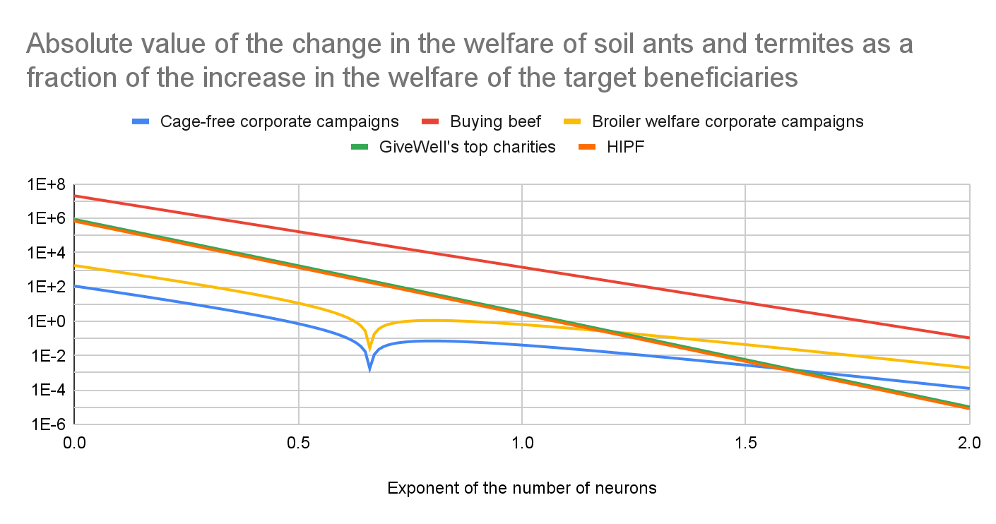 I believe effects on soil animals are much larger than those on target beneficiaries. I am confident the exponent of the number of neurons is the parameter which affects the ratio between the effects on soil animals and target beneficiaries the most by far, and effects on soil animals dominate at least for values of the exponent up to 1, which are the ones I consider plausible. I get the following increase in the welfare of soil ants, termites, springtails, mites, and nematodes as a fraction of the increase in the welfare of the target beneficiaries. For exponents of the number of neurons of 0.19, 0.5, and 1: