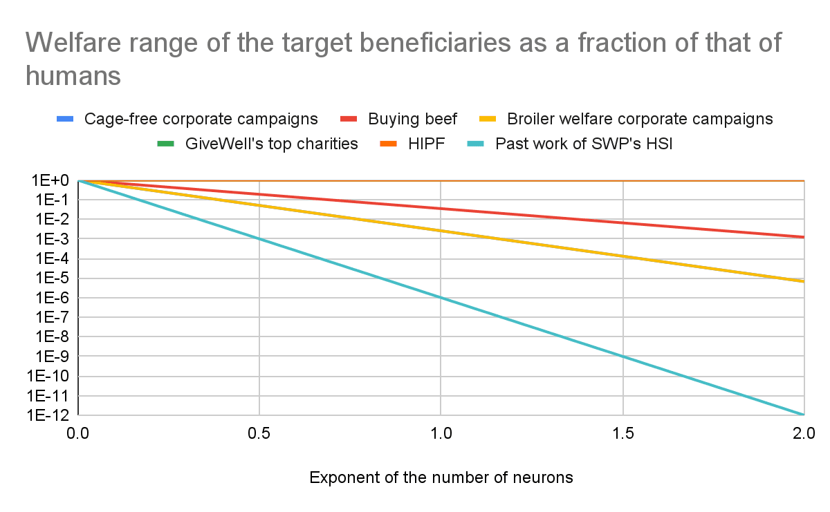 - 0.5, corresponding to my best guesses for the welfare ranges, the number of neurons has to become 100 (= 10^(1/0.5)) times as large for the welfare range to become 10 times as large.