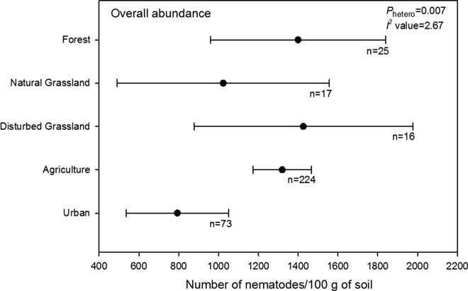Figure 7 of the meta-analysis of Pothula et al. (2019) also suggests it is very unclear whether agricultural land has more or fewer soil nematodes than forests.