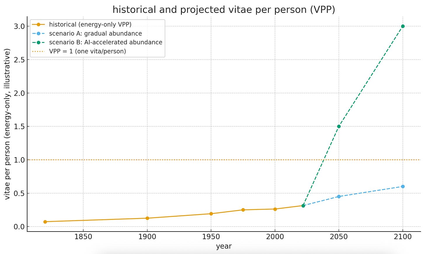 Historically, civilization has operated at well under one coastal-elite life per person. VPP is ~0.3 today. The interesting question is not ‘will there be jobs?’ but “can AI + new energy push us to 3–10 VPP without wrecking the world?’”