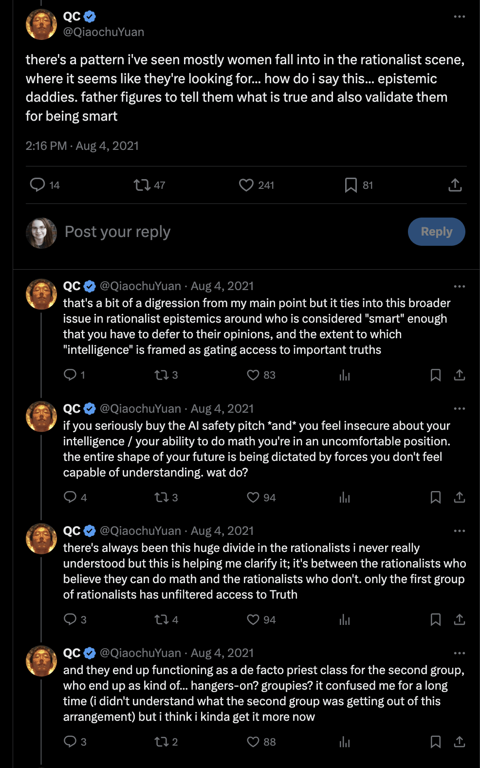 Other people have talked about this phenomenon from various angles, but it all feels tepid to me. Qiaochu Yuan’s thread on the search for epistemic daddies has some serious issues, but tepidness is not one of them.