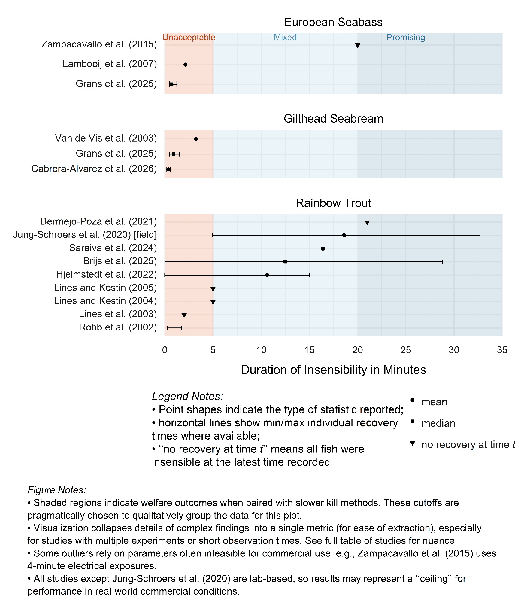 Figure 1 below shows a study-level summary of insensibility durations that includes both fish who recover sensibility as well as those that never recover (so we use the phrase “insensibility duration” instead of “recovery time”). For seabream and seabass, the plot shows how few studies have measured insensibility duration, with most of those pointing to very rapid recovery times. However, for rainbow trout, the plot looks more optimistic: several averages, including promising results from a field trial, cross the ten-minute mark. More details on these points below.