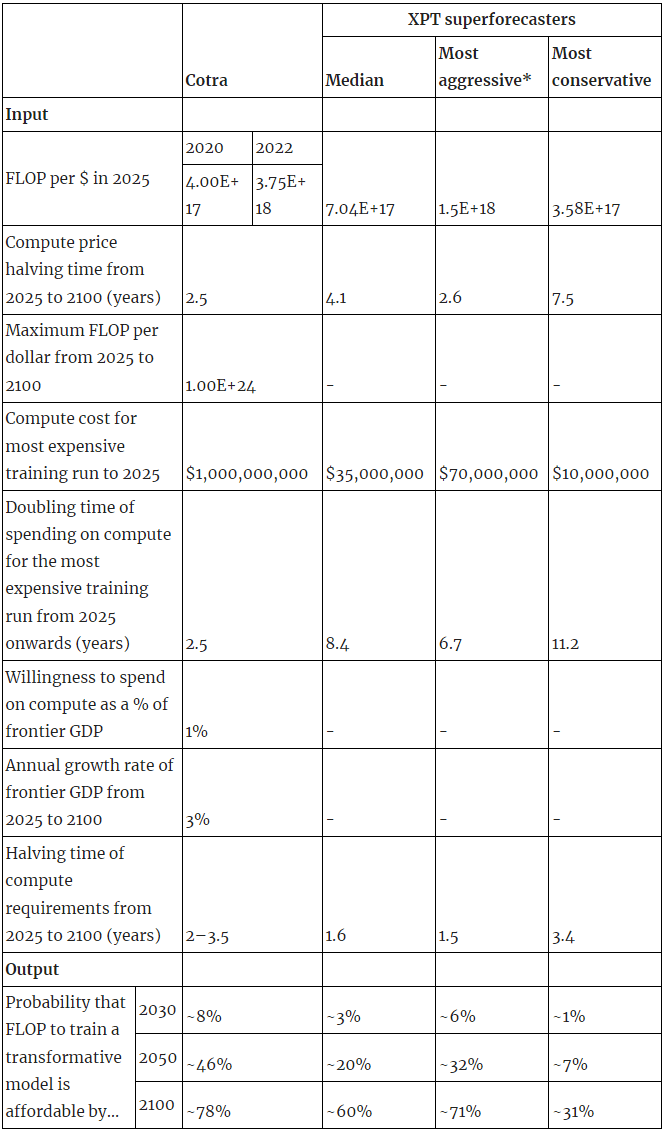- That said, Cotra is substantially basing her forecasts on past trends on specific benchmarks, so I still think the XPT forecasts should be viewed as somewhat indicative.