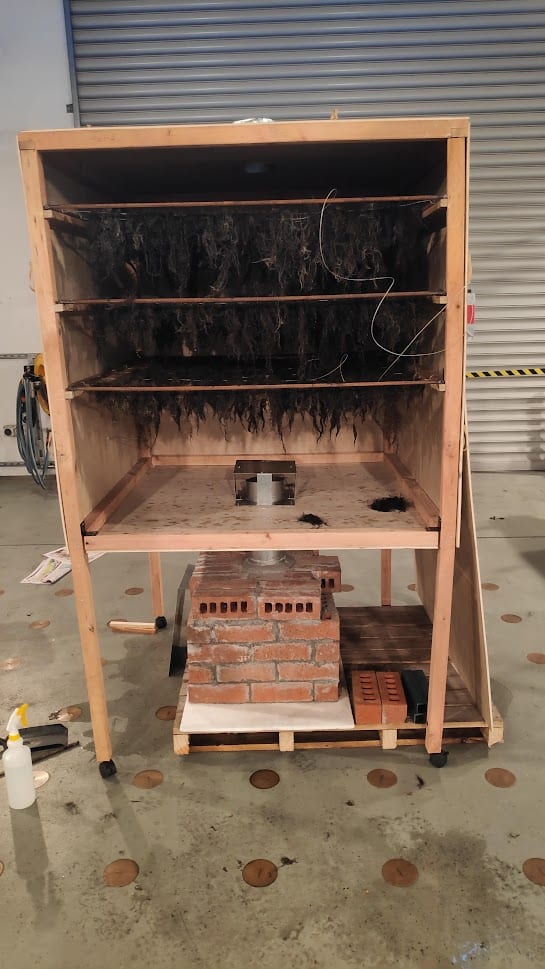 Seaweed racks ready to be dried by fire underneath. | Simon Charman, an undergraduate mechanical engineering student at University of Canterbury, who took an in-person independent course of study under Dr. David Denkenberger, designed a prototype wood fired seaweed dryer. Dr. Denkenberger and Simon prioritized a design that could be scaled up without much infrastructure. They tested the prototype on the seaweed species, Gracilaria chilensis. |