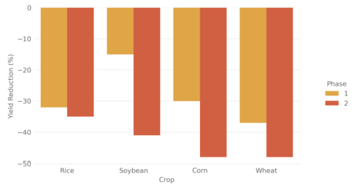 Soybean is least affected while wheat, rice and corn decline roughly by the same amount. Overall Europe, North and South America and large parts of India, China and Indonesia are projected to face major yield reductions of up to 95% while most African countries are scarcely affected. The findings clearly indicate hotspot regions which align with the level of industrialization of agriculture and highlight the need for preparation.