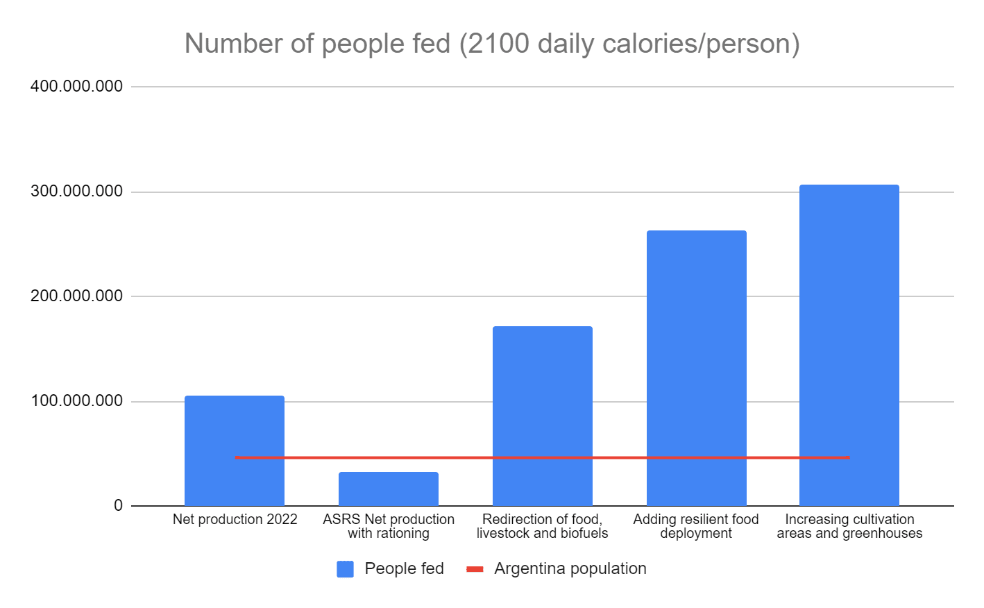 Una guerra nuclear, una erupción volcánica, o el impacto de un asteroide o cometa pueden reducir la cantidad de luz solar que alcanza la superficie terrestre, de la que depende el sistema alimentario global. Los rendimientos agrícolas caerían en picado debido a la bajada de temperaturas y precipitaciones, en lo que se define como un Escenario de Reducción Abrupta de la Luz Solar (ERALS). La región de Argentina puede tener un papel clave en caso de que esto ocurriese. Aquí se presenta y se modeliza un conjunto de intervenciones de respuesta que permitirían prevenir la hambruna en Argentina o incluso América Latina en general, incluyendo: redirección de alimentos usados como materias primas en la agricultura animal y producción de biocombustibles, racionamiento, relocalización de cultivos, despliegue de invernaderos simples y cultivo de algas, entre otras.