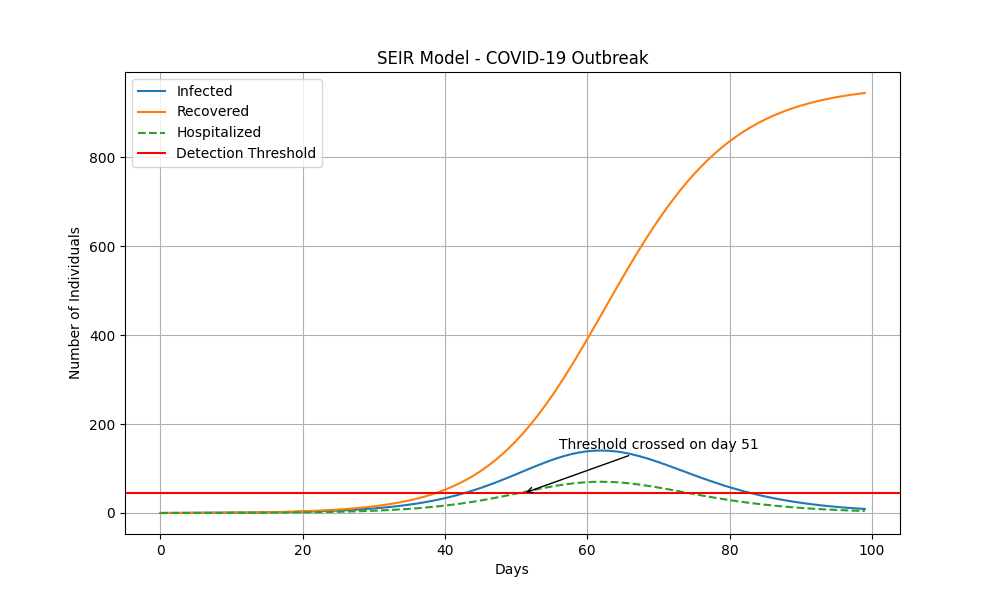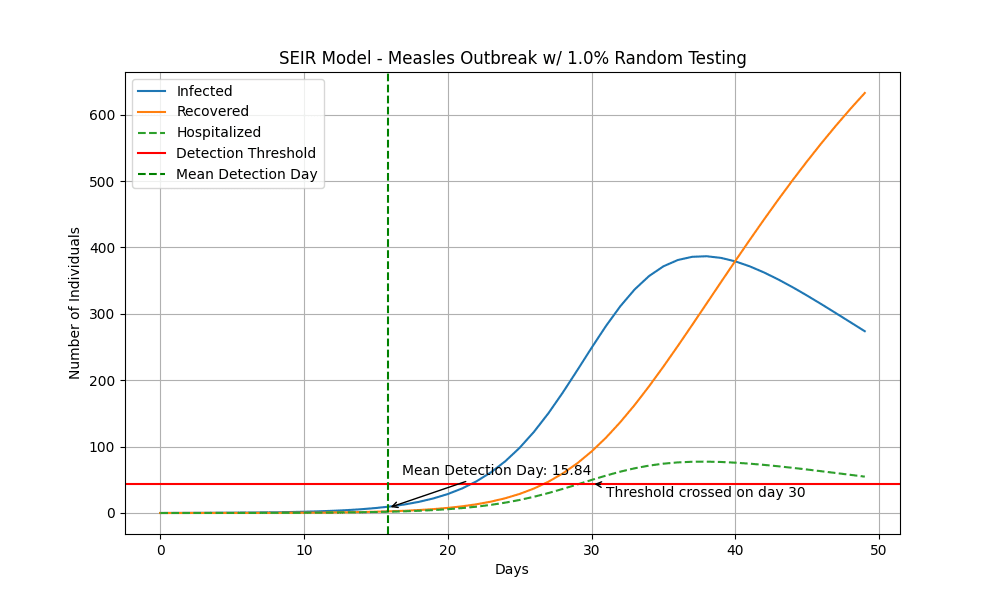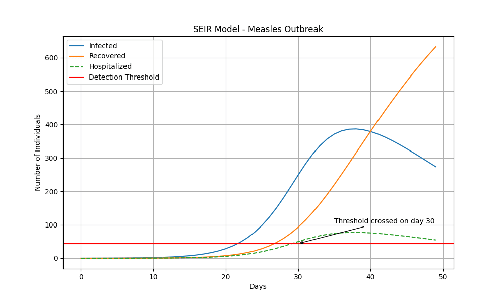 Deploying a very simple SEIR model[7], we see that measles crosses this detection threshold after 30 days: