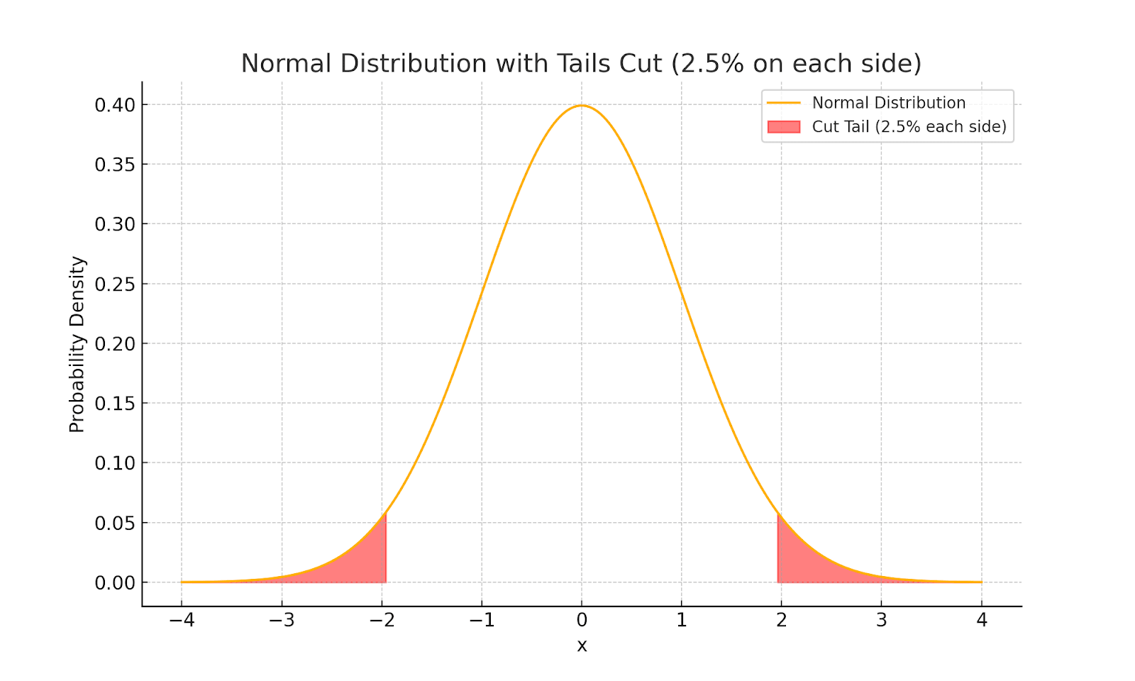 - Tails-Excluded EV: An alternative method for incorporating risk aversion excludes very improbable outcomes. Outcomes are ranked by value to form a distribution, and the extreme tails, which represent the worst and best outcomes in the distribution, under some probability threshold, e.g., 0.5%, are cut out. It then rescales the remaining probabilities. In a normal distribution, this corresponds to ignoring the left and right tails.
