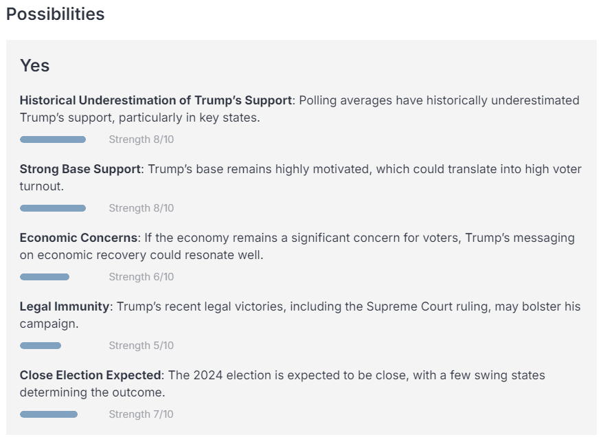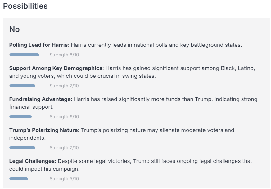 Based on these sources and its wealth of prior knowledge, FiveThirtyNine compiles a summary of key facts. Given these facts, it’s asked to give reasons for and against Trump winning the election, before weighing each reason based on its strength and salience.