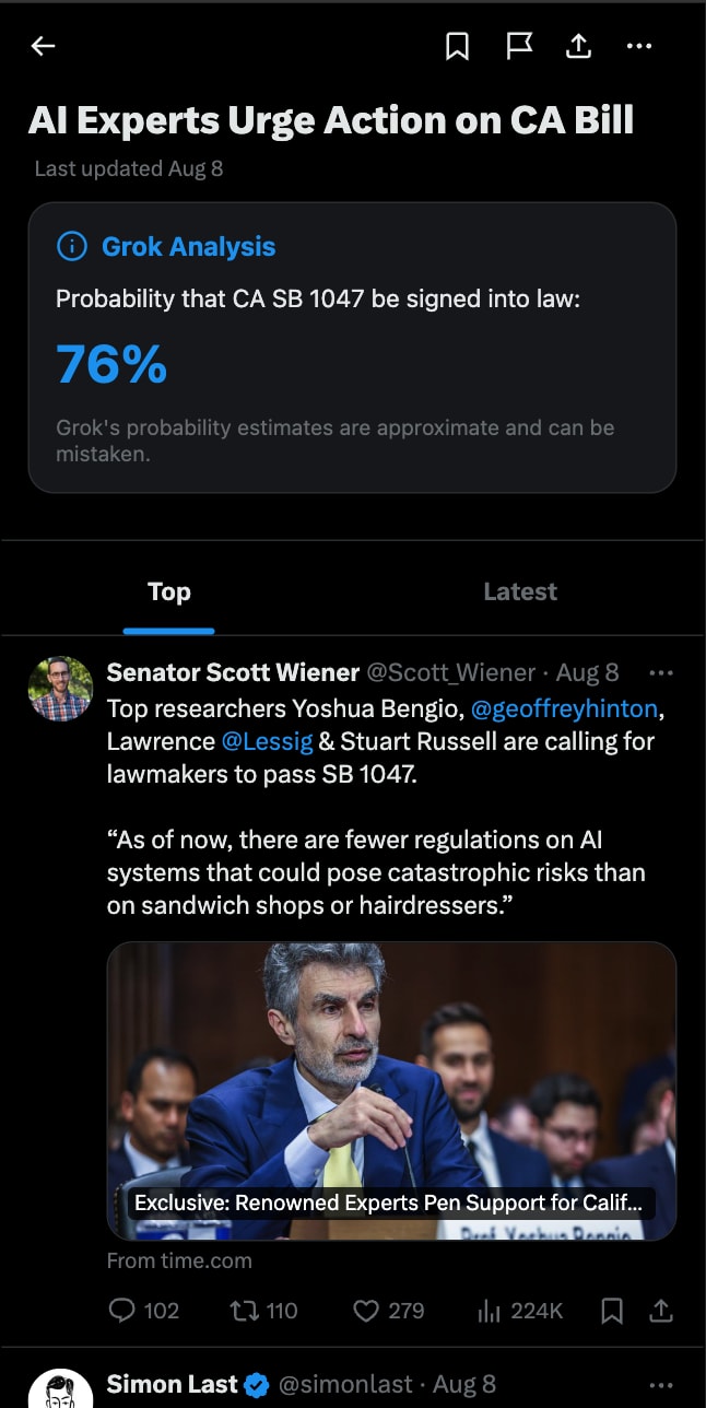 News stories. Forecasting could also complement news stories and topics. For example, for news associated with California AI Safety bill SB 1047, a forecasting bot could let users know the probability that it gets signed into law.