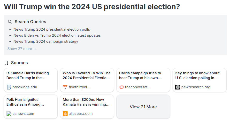 FiveThirtyNine can be given a query—for example, “Will Trump win the 2024 US presidential election?” FiveThirtyNine is prompted to behave like an “AI that is superhuman at forecasting”. It is then asked to make a series of search engine queries for news and opinion articles that might contribute to its prediction. (The following example from FiveThirtyNine uses GPT-4o as the base LLM.)