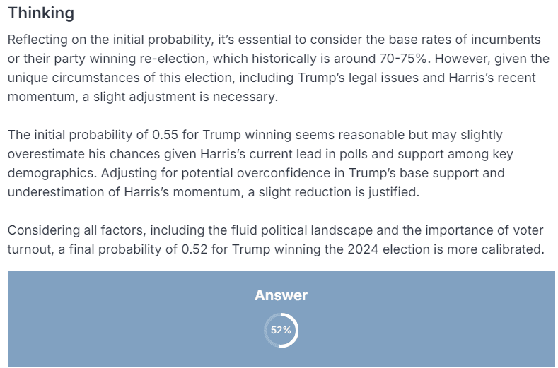 Finally, FiveThirtyNine aggregates its considerations while adjusting for negativity and sensationalism bias in news sources and outputs a tentative probability. It is asked to sanity check this probability and adjust it up or down based on further reasoning, before putting out a final, calibrated probability—in this case, 52%.