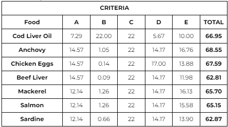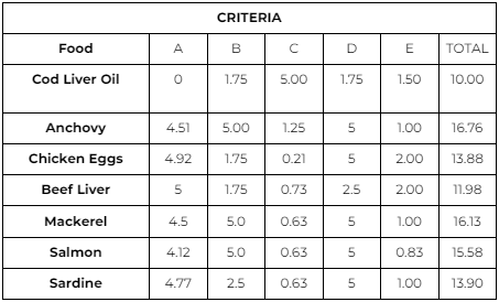 Regarding cod liver oil, which received the highest score in the evaluation, it is noted that although its distribution is not as extensive and it does not contain a high concentration of other essential macronutrients and micronutrients, it is the food with the highest vitamin D content compared to the others evaluated. Additionally, it contains additional components that improve the absorption of this vitamin in the human body, making it an important source of vitamin D, despite its limitations in terms of availability and general nutritional balance.