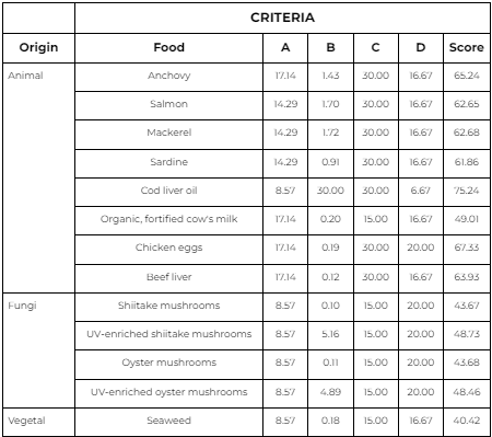 It is important to note that, with the goal of selecting the most beneficial foods in terms of vitamin D, higher scores were assigned to the Bioavailability and Vitamin D Concentration criteria.