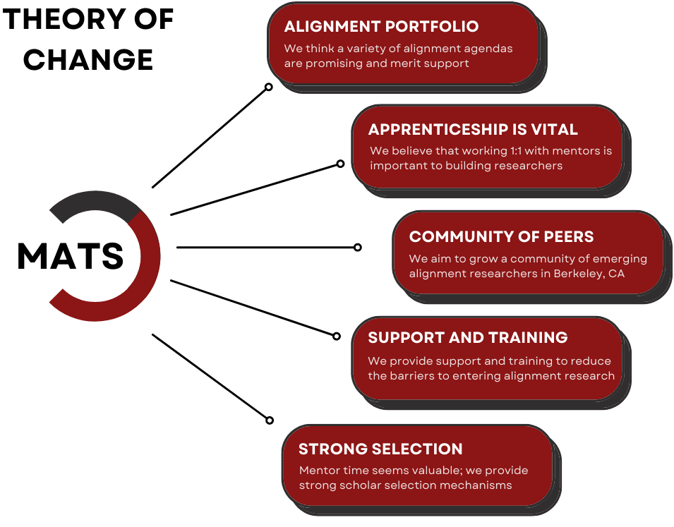 The ML Alignment & Theory Scholars (MATS) program aims to find and train talented individuals for what we see as the world’s most urgent and talent-constrained problem: reducing risks from unaligned artificial intelligence. We believe that ambitious young researchers from a variety of backgrounds have the potential to contribute to the field of alignment research. We aim to provide the mentorship, curriculum, financial support, and community necessary to aid this transition. Please see our theory of change and website for more details.
