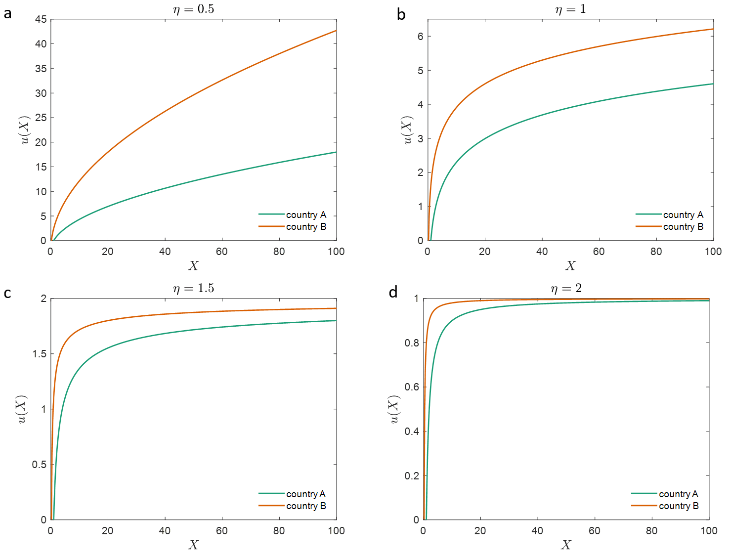 If it doesn’t seem intuitive that, for two people with the same monetary income, money should go to the person in the country where goods are more expensive, recall that this person has a lower level of consumption. By contrast, consider people with different price values, but the same consumption: