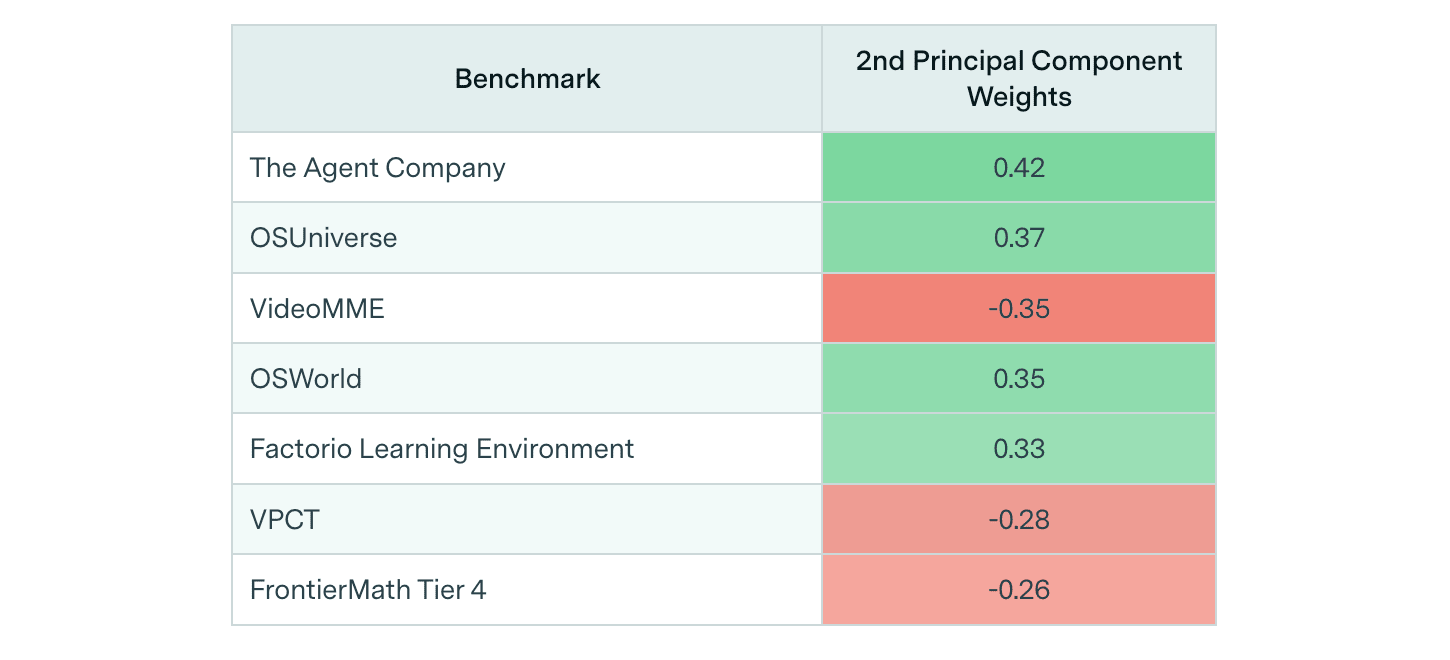 What is this second component? Here are the top weights, by absolute value, that this component assigns to the benchmarks, again accounting for over 80% of the total weight. By construction, this component is orthogonal to the main “general capability” component. When I first saw this, I said it looked something like, “good at agentic tasks, but bad at vision… and also bad at math?”