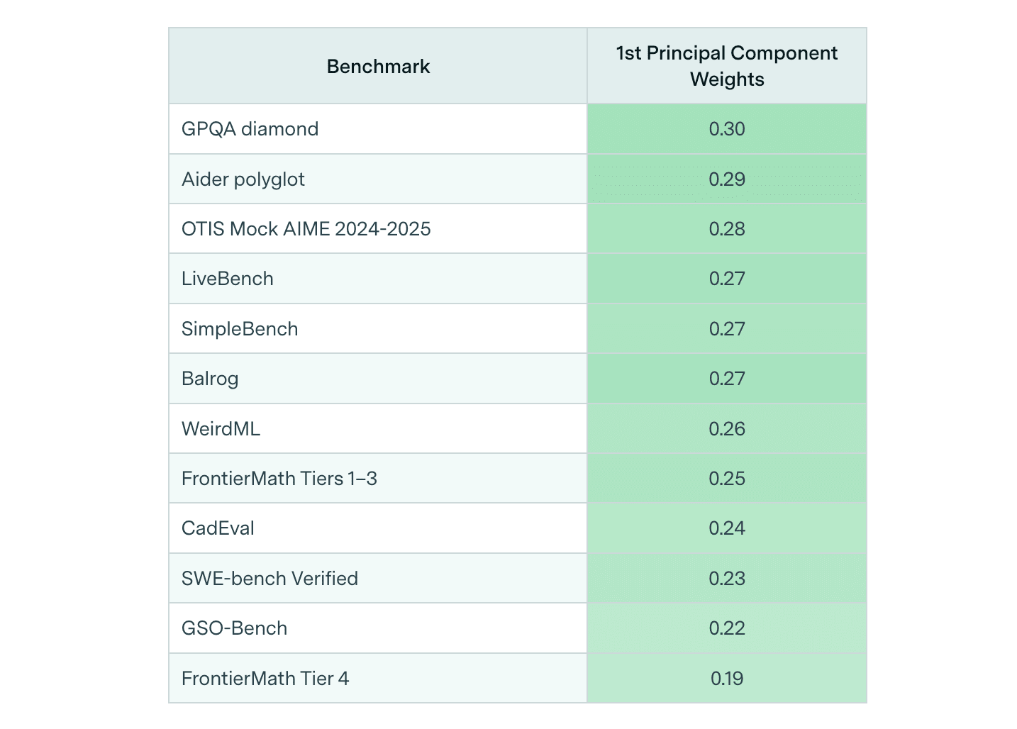When we do this on the raw data underlying ECI, the first component captures about half the variance of the dataset.[1][2] The table below shows the weights on the different benchmarks in this component, accounting for 80% of the total weight. Note that the weights are all positive and not very dispersed. That is, PCA also finds a single “general capability” component.