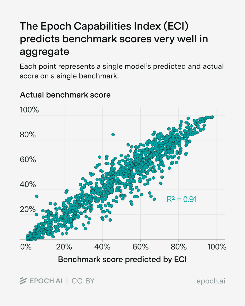 This is one of the lessons of our recent work on the Epoch Capabilities Index (ECI), which combines thirty-nine benchmarks into a single capabilities score. If benchmarks were generally uncorrelated with each other, you’d expect to see large residuals: the benchmark scores predicted by a model’s ECI number wouldn’t match the model’s actual benchmark scores. As it turns out, we see a very good match. In other words, our nominally high-dimensional dataset is well-approximated by just a single dimension.