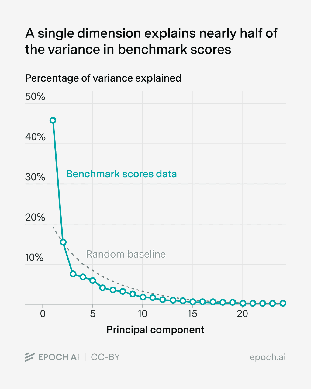 To look beyond this dimension, we can do a Principal Component Analysis (PCA). This basically asks: if we make synthetic “components” by taking weighted sums of the different benchmark scores, what’s the most variance in the dataset we can account for with the fewest number of components?