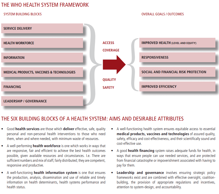 - Effects: impacting on outcomes, equity, financial risk protection, and responsiveness