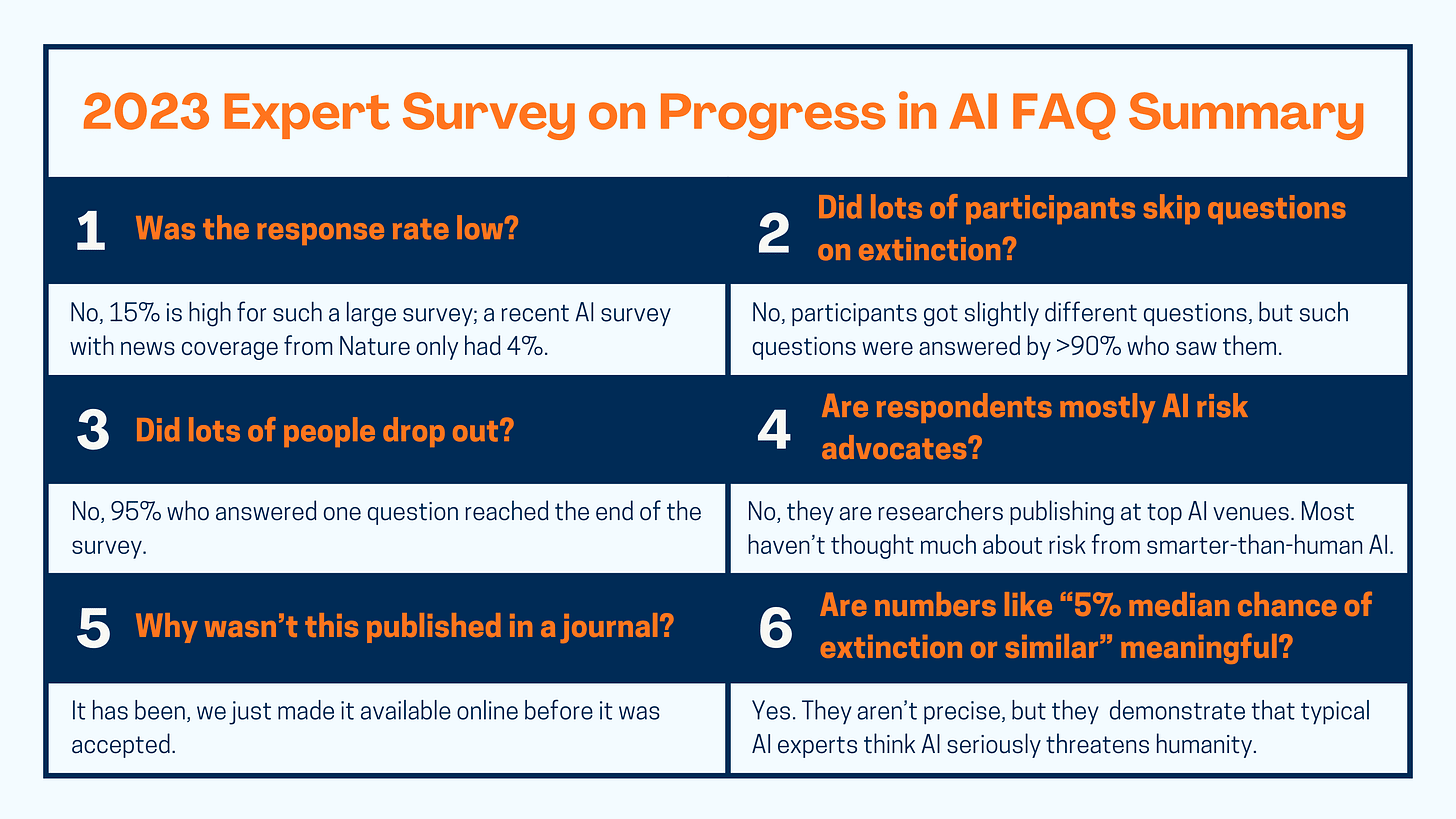 So the real situation is that every respondent who completed the survey was asked about outcomes similar to extinction in two different ways, across four different precise questions. These four question variations all got similar answers—in 2023, median 5% chance of something like human extinction (one question got 10%). So we can say that across thousands of researchers, the median view puts at least a 5% chance on extinction or similar from advanced AI, and this finding is robust across question variants.