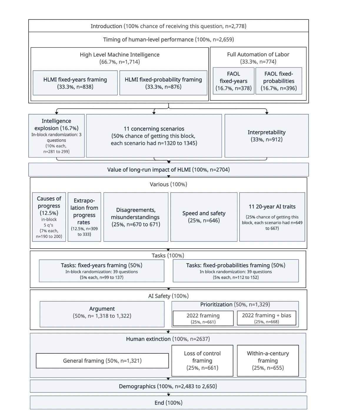 Here’s the map of paths through the survey and how many people were given which questions in 2023. Respondents start at the introduction then randomly receive one of the questions or sub-questions at each stage. The randomization shown below is uncorrelated, except that respondents get either the “fixed-years” or “fixed-probabilities” framing throughout for questions that use those, to reduce confusion.2