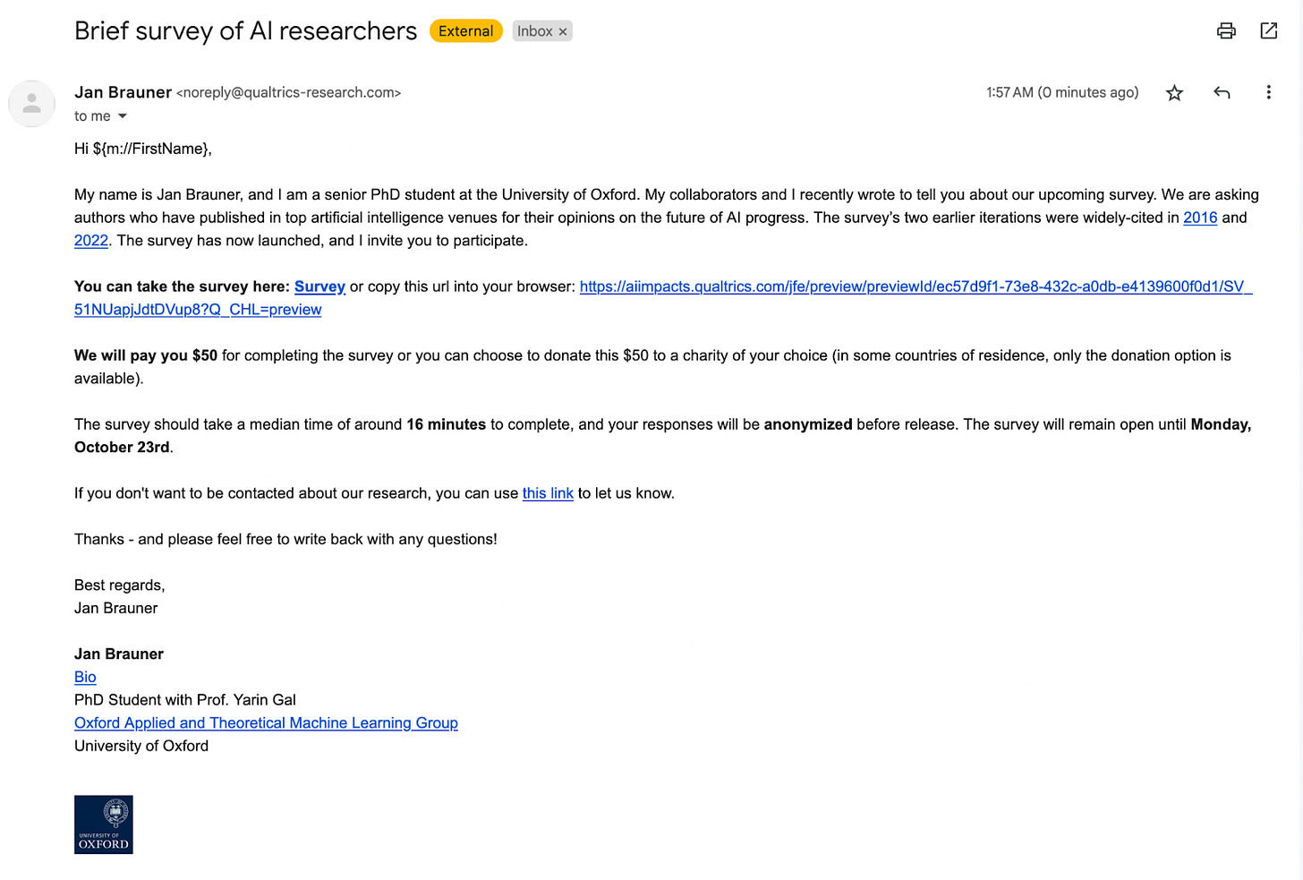 We try to minimize the opportunity for unit non-response bias by writing directly to every researcher we can who has published in six top AI venues rather than having people share the survey, and making the invitation vague: avoiding directly mentioning anything like risks at all, let alone extinction risk. For instance, the 2023 survey invitation describes the topic as “the future of AI progress”9.