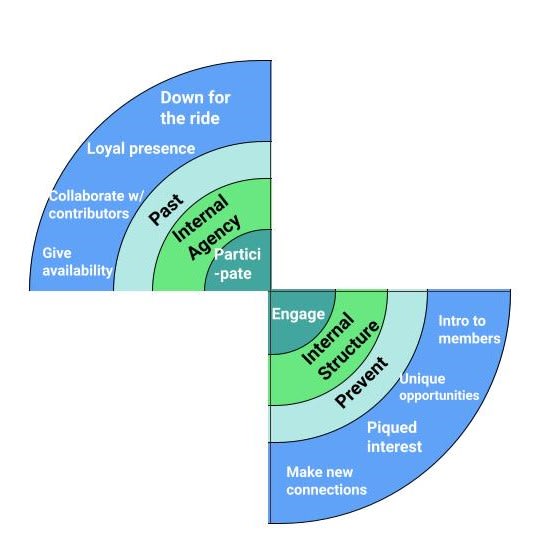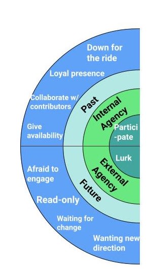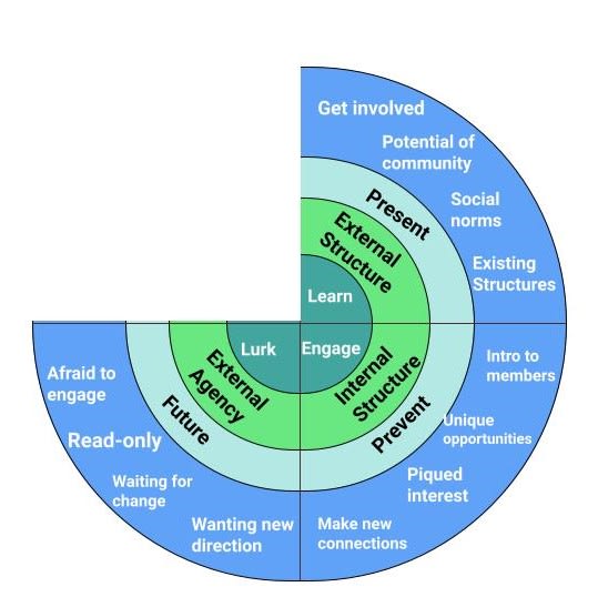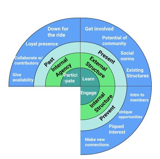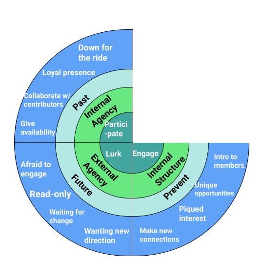 Often there is the chicken and the egg problem with starting a community. At what point are the actions created and captured and significant enough that are worth formulating structure around. Because of this, I have adapted Giddens’ Structuration theory into my model. He claims that an individual’s autonomy is influenced by structure, and structures are maintained and adapted through the exercise of agency. Through this theory, we can understand that in the four community actions, there needs to be balance between the cycle actions towards community consensus. On the left side of the wheel, it is based on agency (actions) to move things forward, and the right side of the wheel shows the structure needed to sustain the actions for further growth.