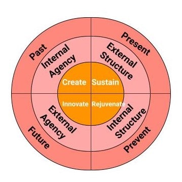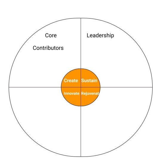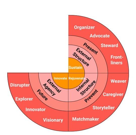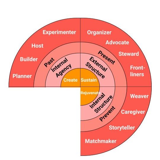 I have added to my model the moment in time in which these actions serve their purpose. The theory behind assigning each action where they fit on a timeline and how they can be affected by intentions and motivations. Creators are getting into action because of Past Actions that did not previously exist. Sustainers are getting into action to give Present Structure that lives for the day-to-day. Rejuvenators are the ones that Prevent Structure which is often referred to as “do things that don’t scale” in start-ups. And Innovate is for Future Actions that have not been achieved yet by the community.