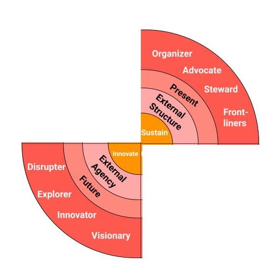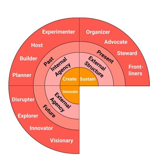 To Innovate for a community, is to explore and disrupt for future conquest. Innovate is based on future agency (actions). They seek bigger and better ideas and opportunities that don’t exist in the existing community and pursue them and share with the existing community. They have the most influence in where the community grows or stagnates for its long-term sustainability.